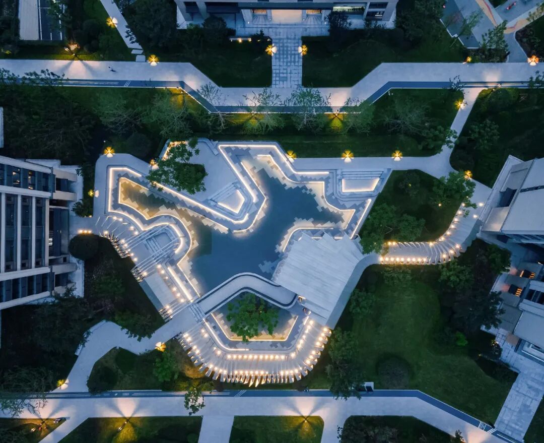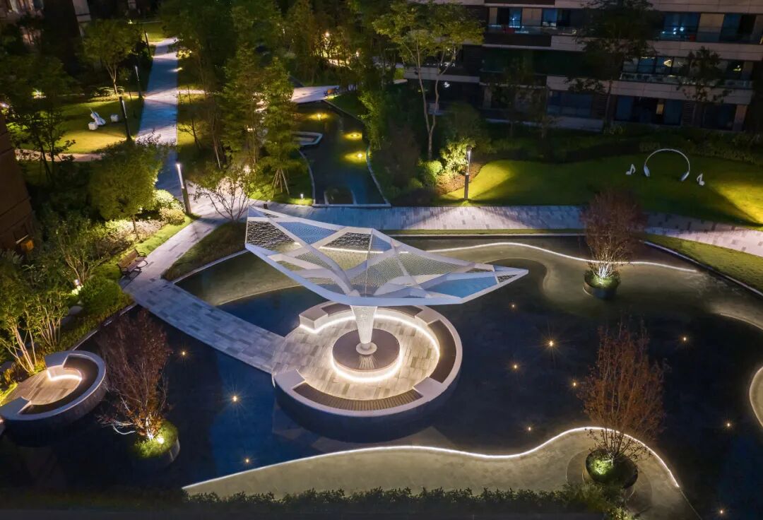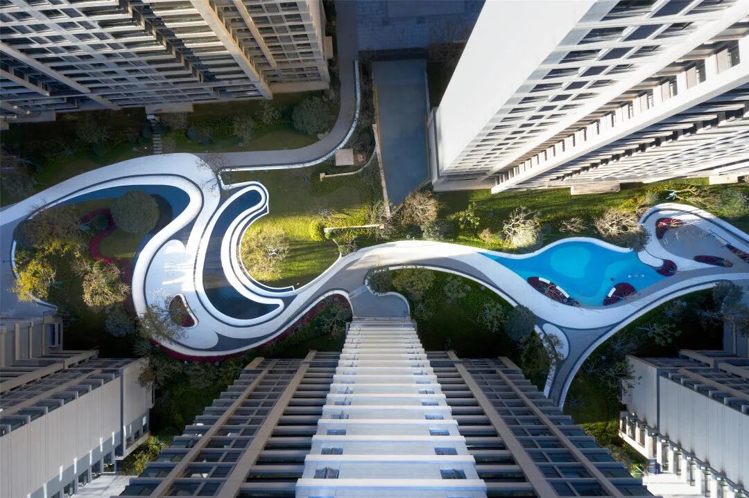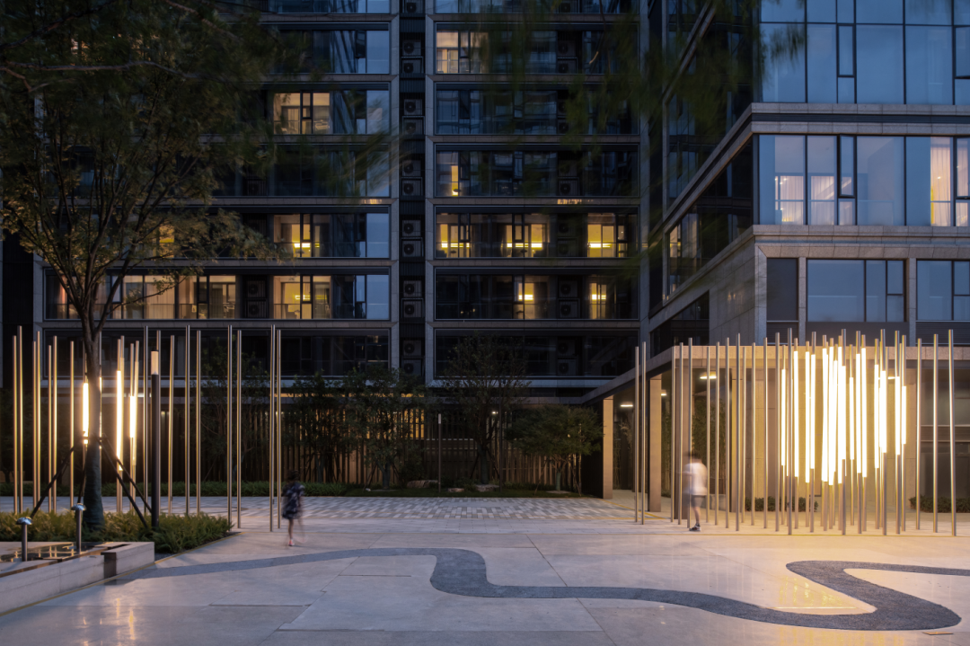 凤起潮鸣居住社区的景观概念来自与案名相关的“月与潮汐”,社区里面的场地、水景、互动艺术装置全部与受月球影响的潮汐变化有关。把月亮拉近到人们的生活里,希望人们可以偶尔放眼远方的虚无缥缈,忘记眼前的五光十色。