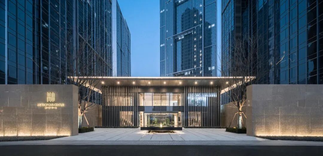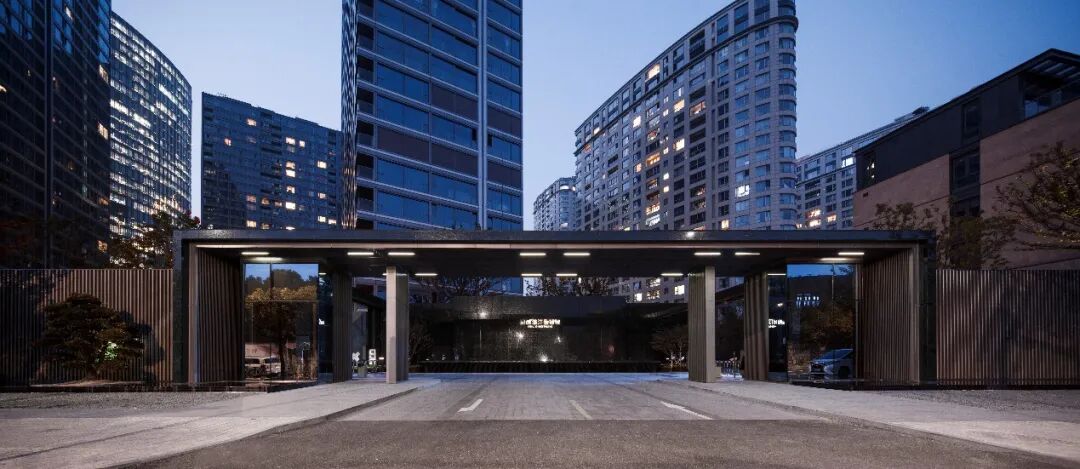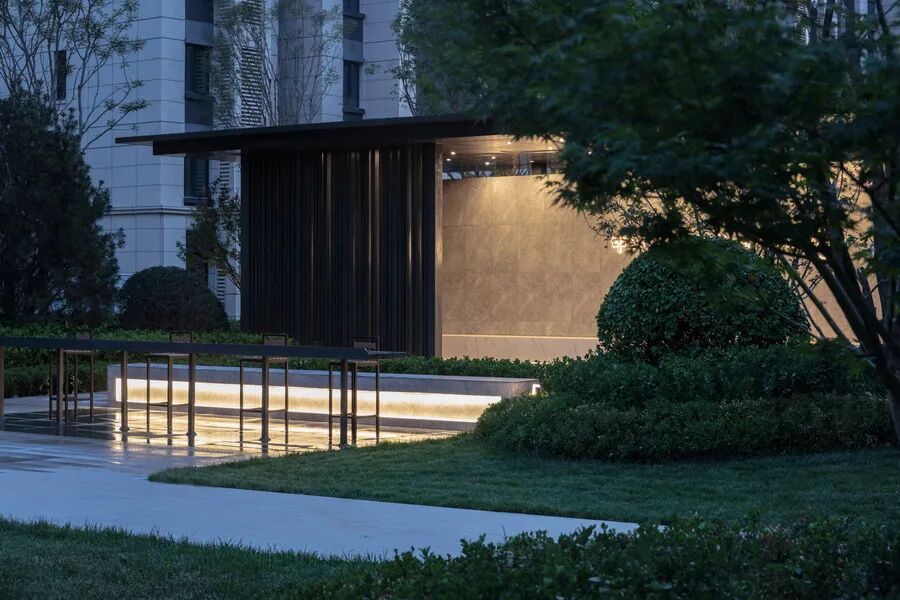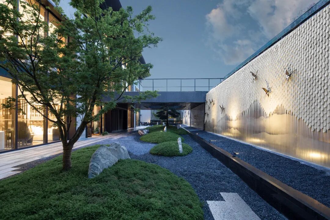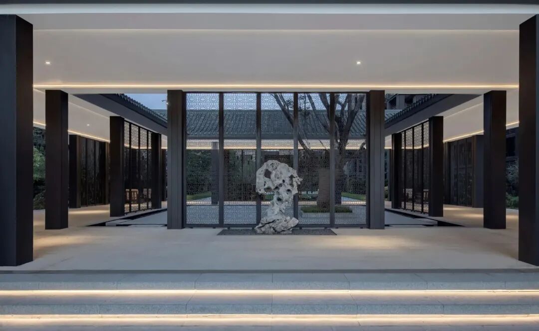 主入口轴线以“礼”“序”“境”为景观核心,通过厚重的大门为园区带来强烈的仪式感,玉宝门廊、山水名堂、光影报廊等传递古韵新风的视觉体验,营造出山水之境的和谐共存之感。