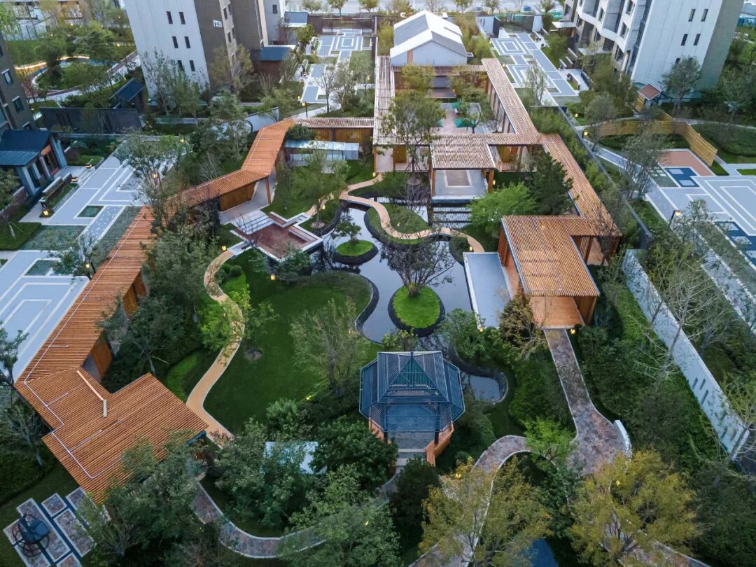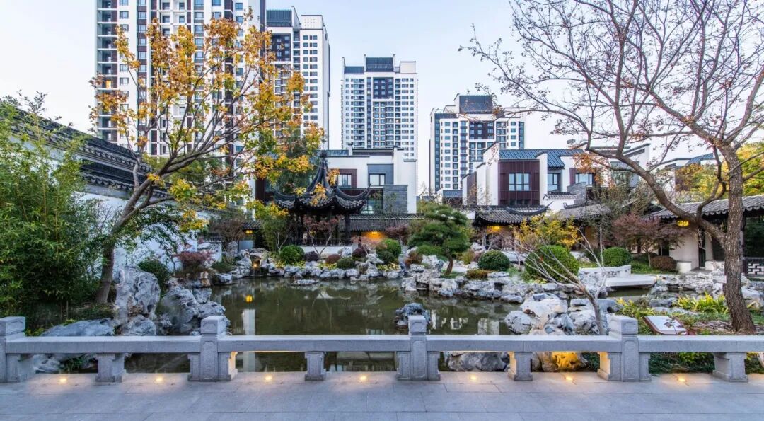 作为私密型的入户宅间组团,全区设计了五个既能与”桥”、”苑”衔接,又相对独立的诗意山水园林。针对不同宅间的场地特征,巧妙借鉴了退思园、耦园、寄畅园、瞻园以及典故“曲水流觞”的经典空间格局。