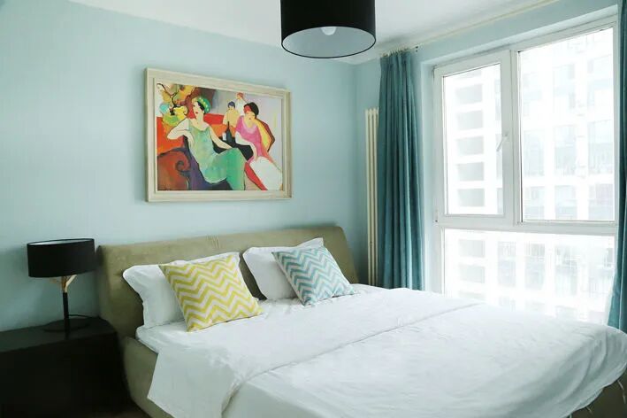 次卧作为临时客卧,在装修风格上与主卧统一,充满个性色彩的装饰挂画为室内增添了一抹亮色,起到活跃气氛的效果。舒适整洁的大床与简而精的家具搭配让室内宽敞通透,大方得体!