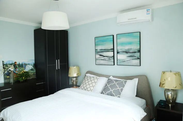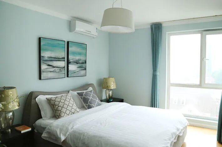 主卧布置得简约清新,淡蓝色墙面下摆放着深棕色衣柜和斗柜等家具,圆弧造型的灰色软包床头的大床整洁舒适,对称摆放的实木床头柜让大床更显中心平稳。