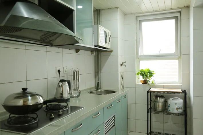 厨房面积很小,定做了一字型浅蓝色柜门的实木橱柜、搁板等,搭配灰色石英石台面和白色墙砖,简洁清新时尚,窗下还放一个金属置物架,收纳一些小厨电等使用方便,空间利用率更高。