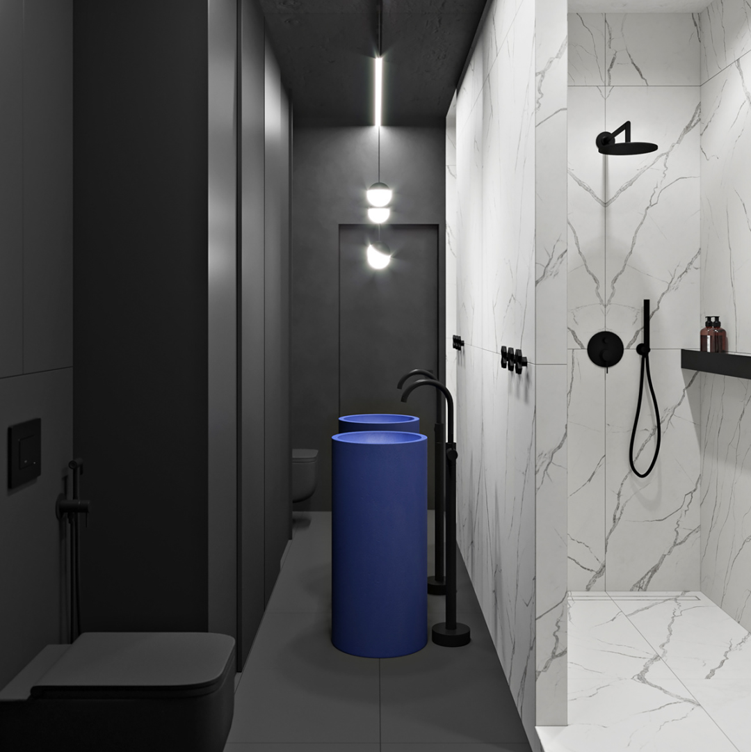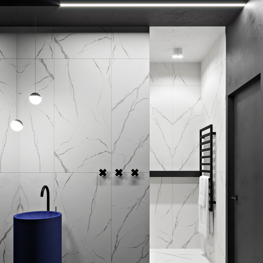 卫生间大理石花纹的瓷砖与黑色饰面,铺满了整个空间,形成一黑一白的鲜明对比。