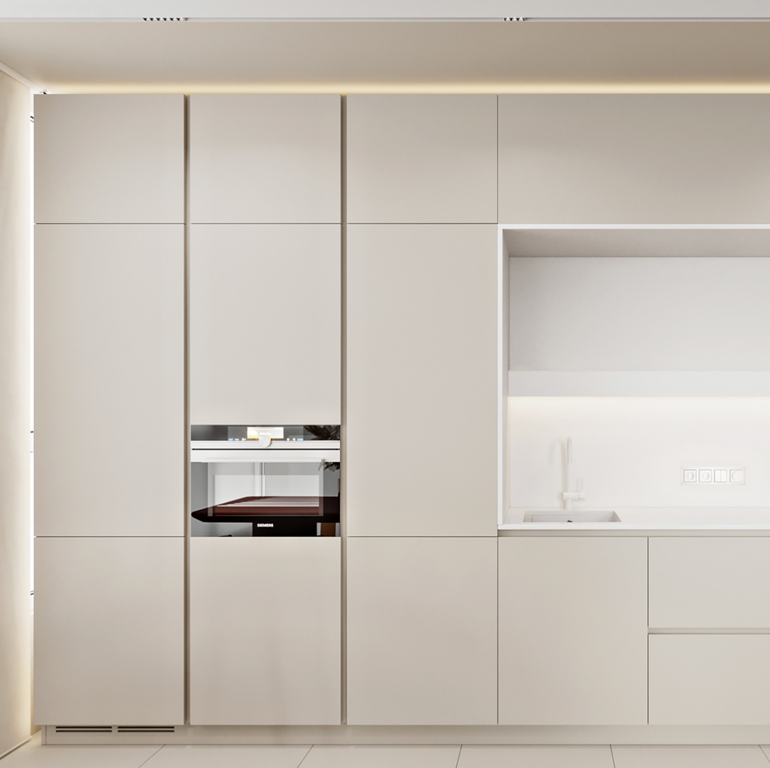 开放式的厨房在客厅旁边,定制的橱柜与各种厨房电器结合,周边还装了内嵌的灯带,让空间照明变得更加舒适不刺眼。