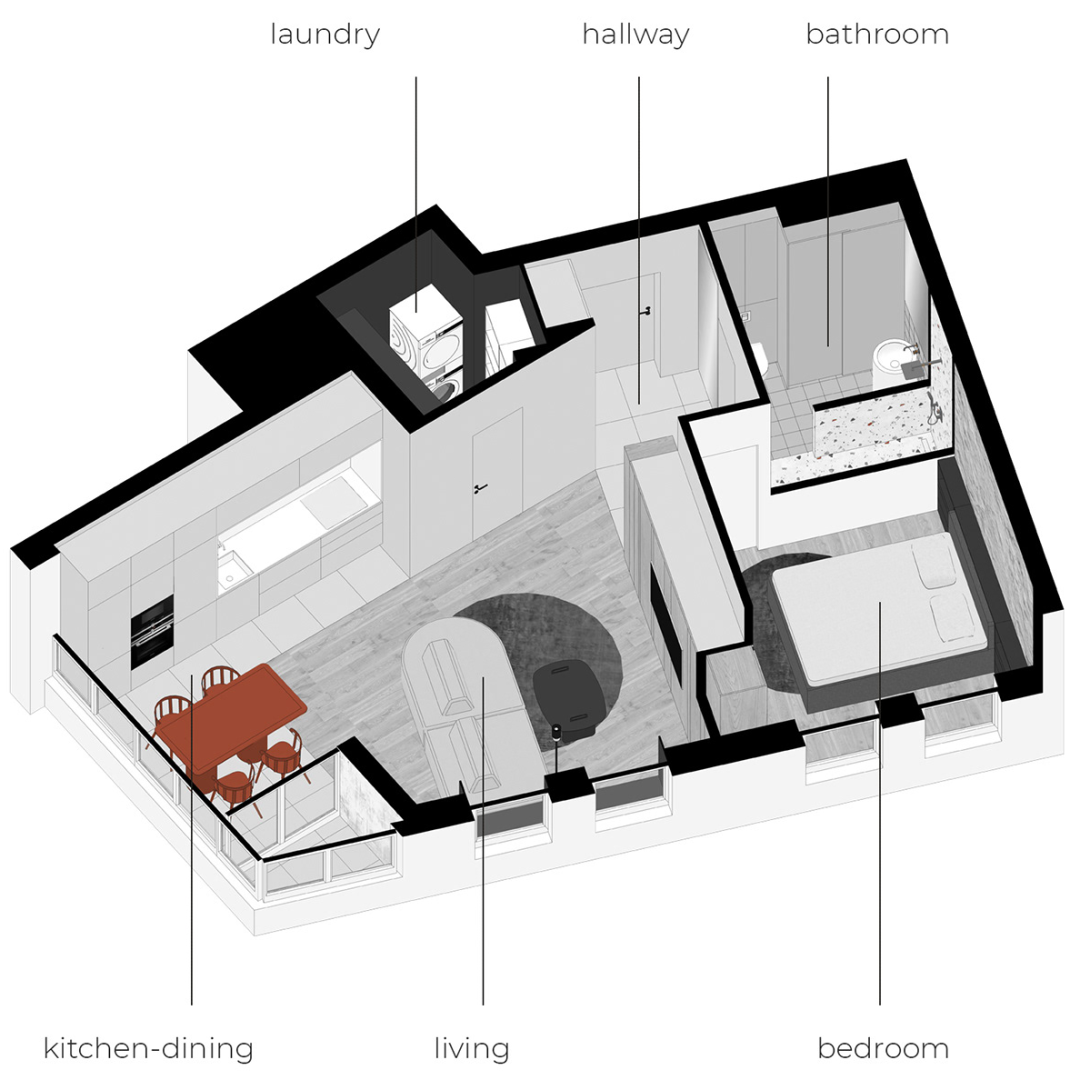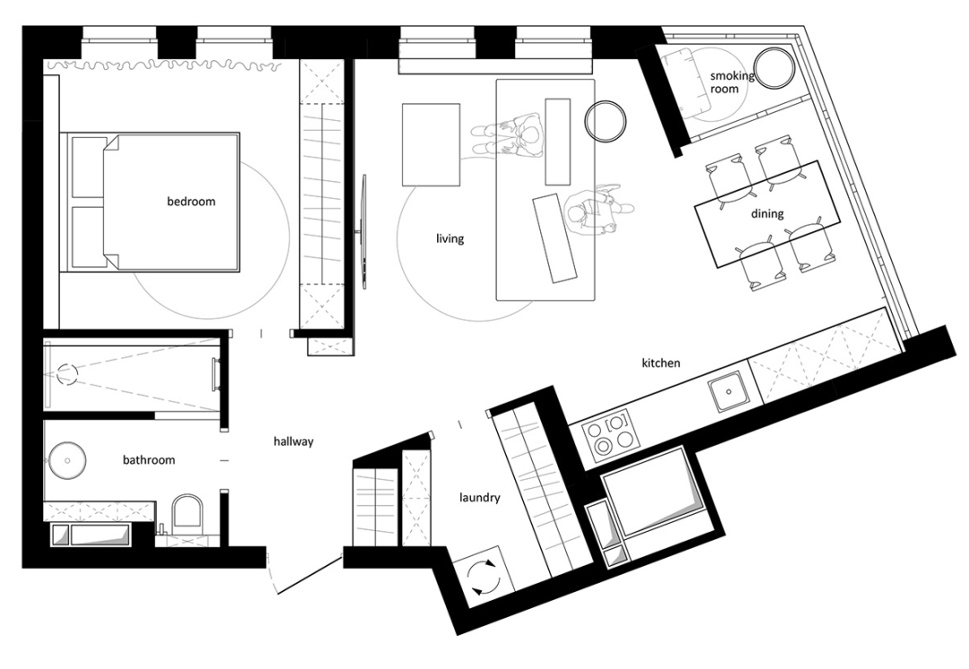 为公寓的原始户型并不方正所以设计师将空间重新做了规划,他们把阳台的隔墙拆除,使其与室内相连,这样设计不仅增大了室内面积,也让整个区域分配显得更为合理。