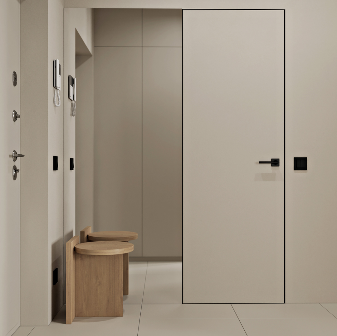 设计师还利用视墙的厚度打造侧边的储物柜,门口的角落区域也被很好利用,落地穿衣镜搭配木质换鞋凳,让出门更方便。