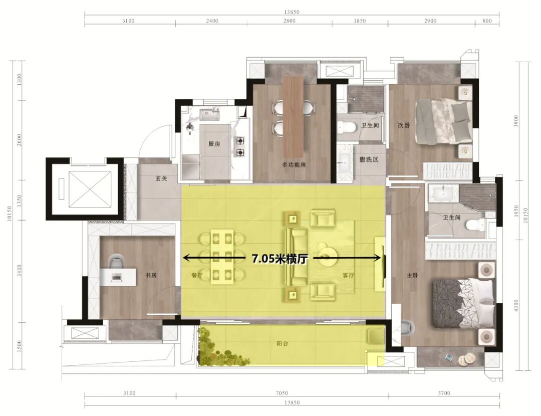 整个户型面宽达到13.85米,横厅设计,公共活动区的客餐厅开间为7.05米,尺度奢阔,搭配近7米的景观阳台,景观、采光、通风都不错,所以无论三房,还是四房,充分满足了每代人对空间的需求。