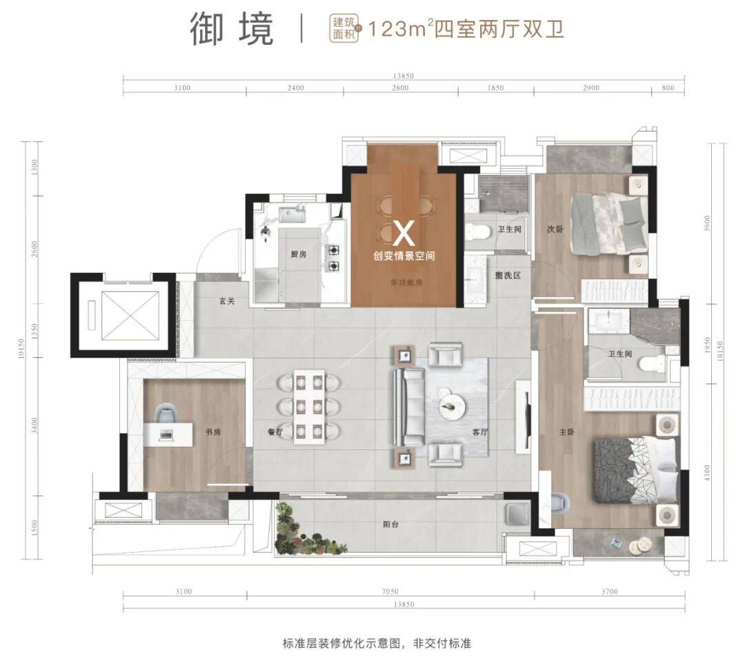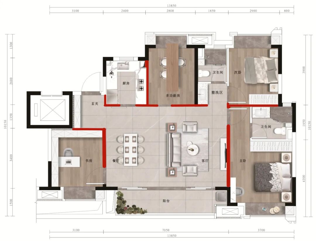以标准层123平米四房户型为例,除次卧与次卫之间的墙体为承重墙外,室内其余的墙体(上图标红部分)都可以拆除,为后期空间创变留下了更多弹性可能。