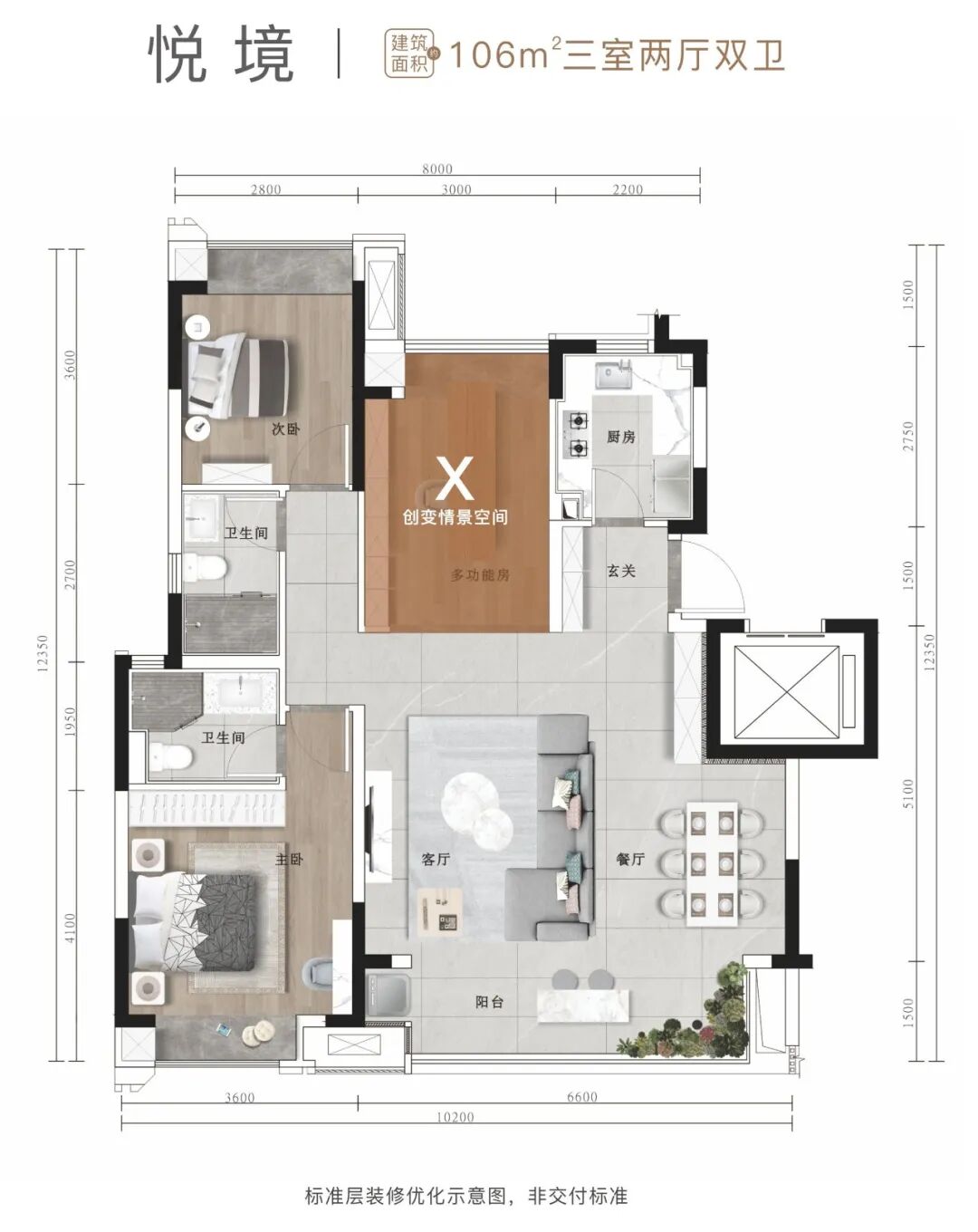 除123平米户型外,崑崙御106平米户型是基于同样的创变设计,唯一不同的是室内在三房、两房间切换,满足小家庭的使用。