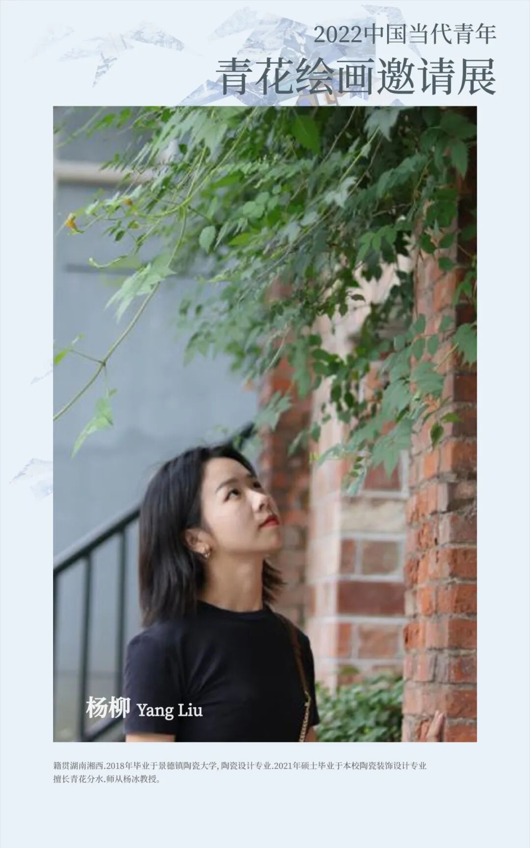 杨柳,(1994.6-)籍贯湖南湘西,2018年毕业于景德镇陶瓷大学,陶瓷设计专业,2021年硕士毕业于本校陶瓷装饰设计专业,师从杨冰教授,擅长青花分水。