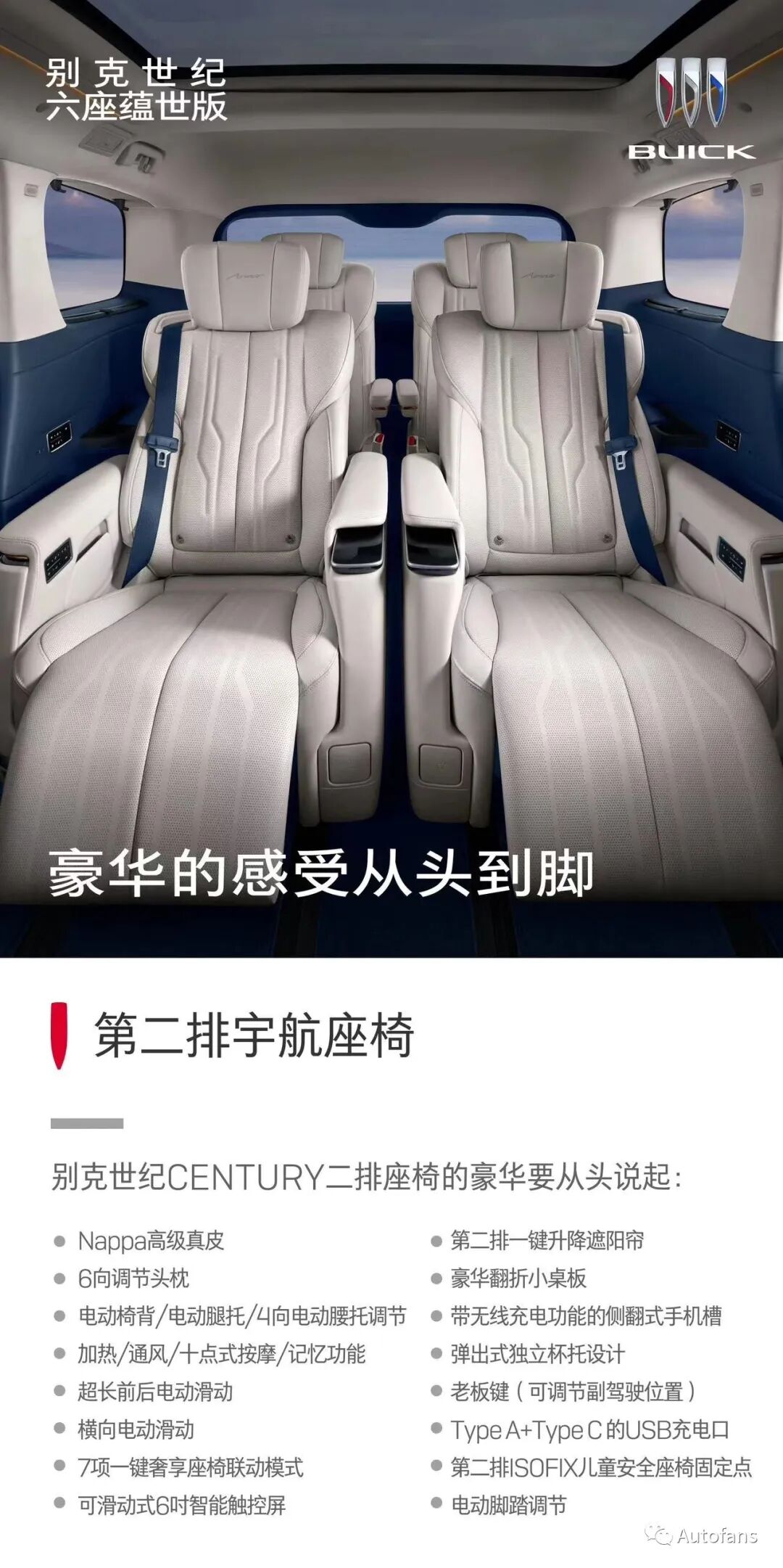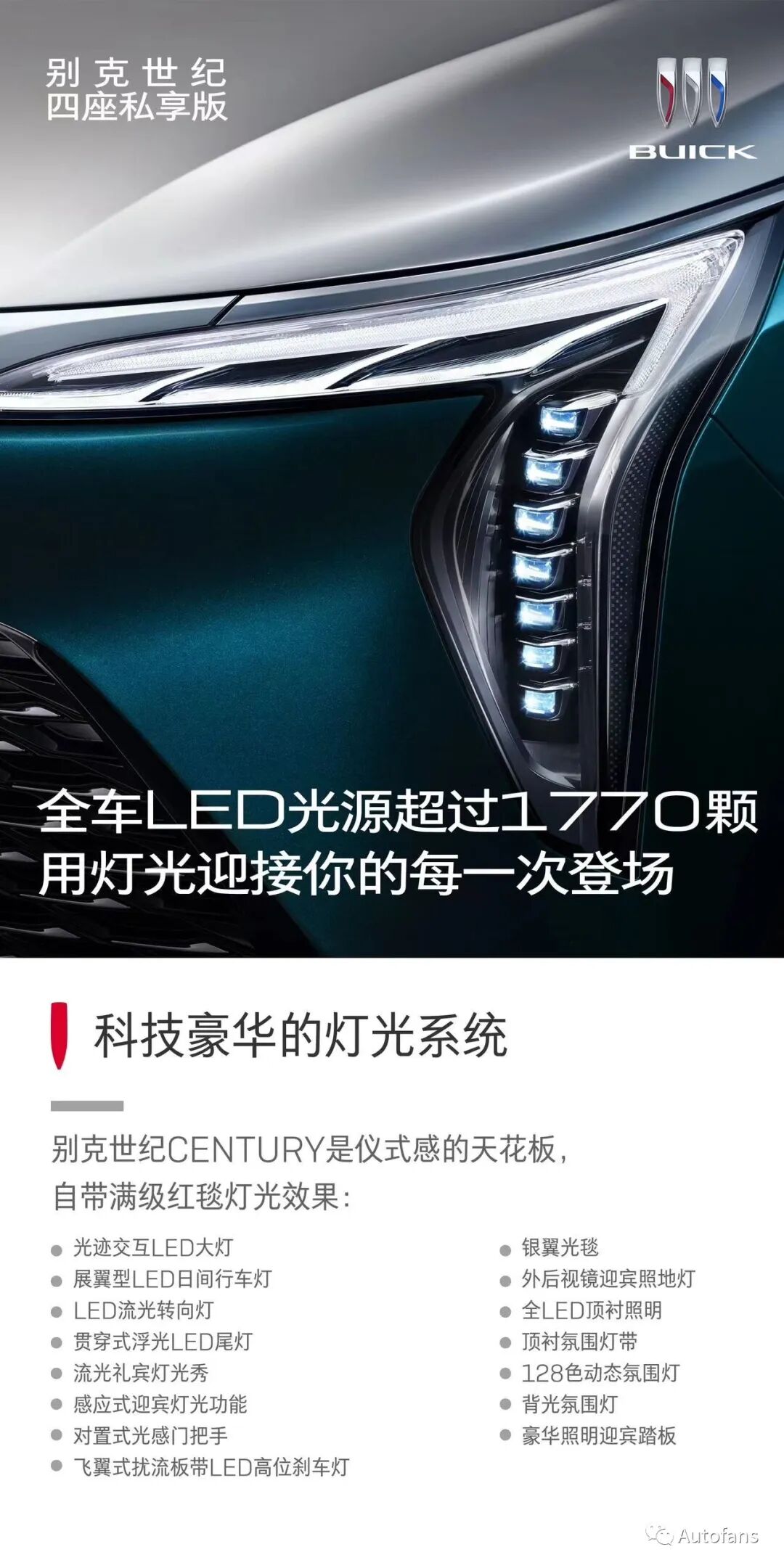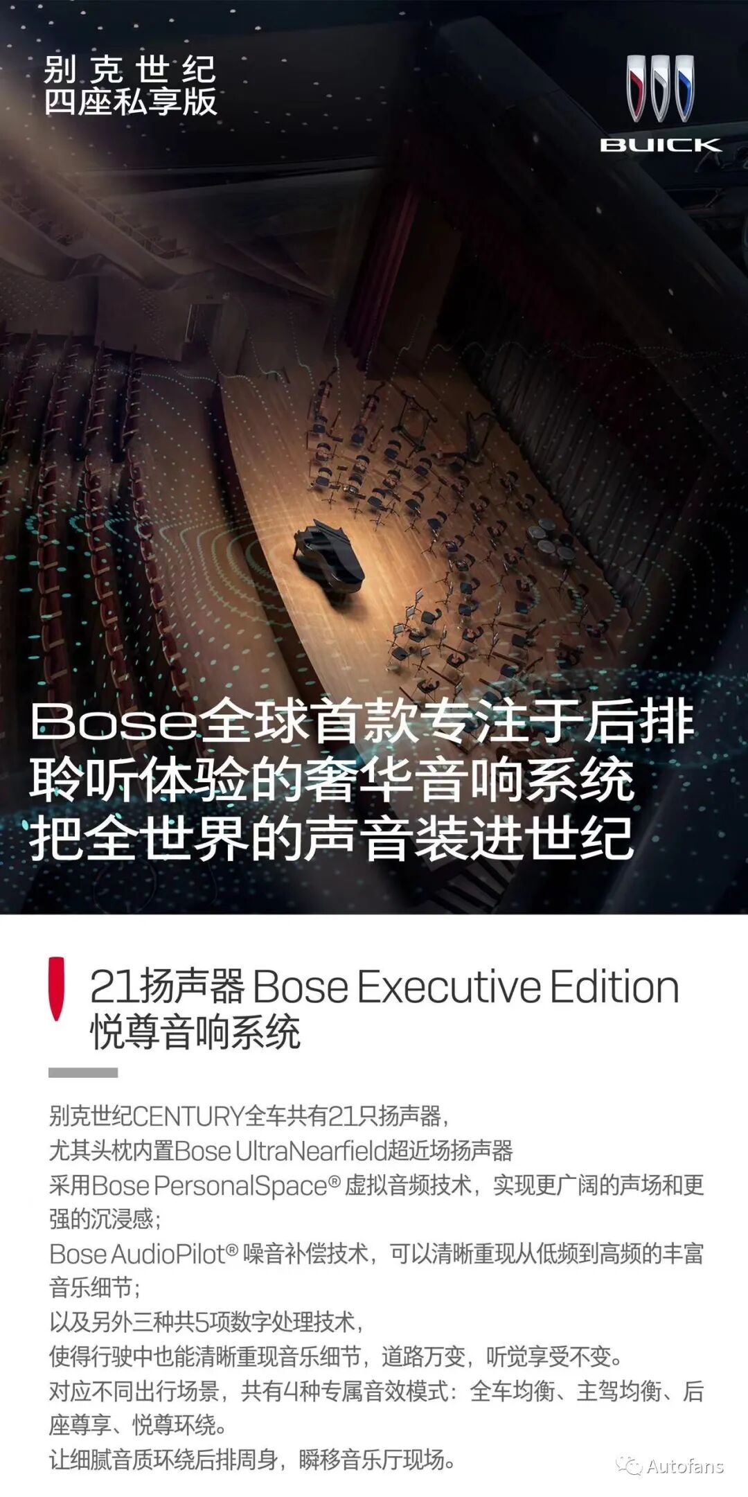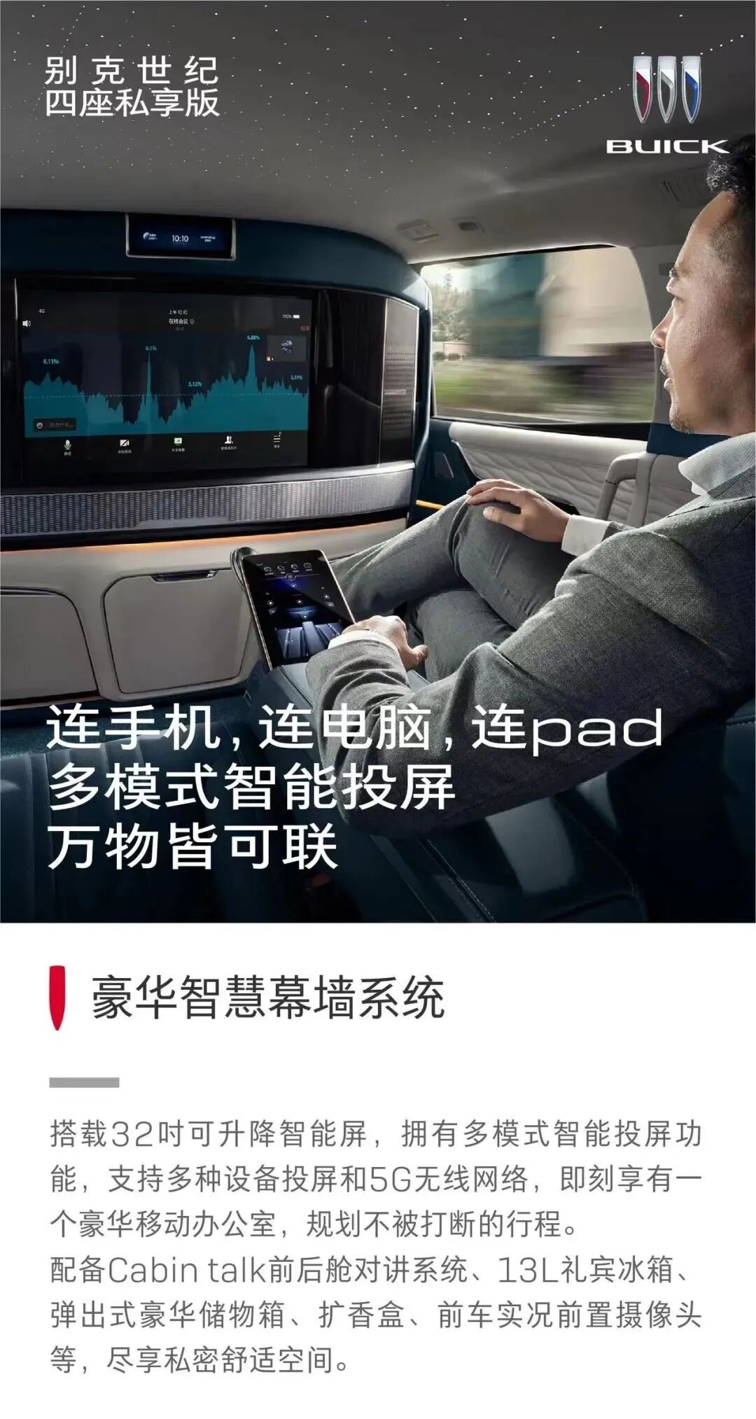 四座私享版开创性地引入豪华智慧幕墙系统,集成了32吋可升降智能屏,仅需一键轻启,标志性的智能大屏就完全升起,将后排座舱升级为奢华与静谧兼备的“私享空间”。该幕墙系统不仅支持多模式智能投屏,并集成了8吋时钟显示屏、Bose音响、13L礼宾冰箱、弹出式大容量储物箱、扩香盒等豪华科技配置,营造出沉浸式的人文智能空间。值得一提的是,别克世纪CENTURY四座车型还提出“云感”理念,带来目前业界功能最丰富的160度云感座椅。超大尺寸的宽体座椅由Fine Nappa半苯胺高级打孔真皮包裹,拥有可延伸式电动腿托和电动翻展式脚踏,延伸后总长度可达616mm。座椅提供18向全电动调节、5大分区加热和18点分区指感按摩功能,其中,颈托和脚踏还采用了石墨烯加热技术,带给乘客如置身云中般的安然惬意体验。此外,新车创新搭载了别克与Bose共同开发的Bose Executive Edition悦尊音响系统,这也是Bose全球首款以后排为优先聆听位置的音响系统,配备有2台数字功放和21个扬声器,其中有16个扬声器布置在后舱,包括后座头枕内置的UltraNearfield超近场扬声器,带来极具音乐厅临场感与氛围感的酣畅听觉享受。