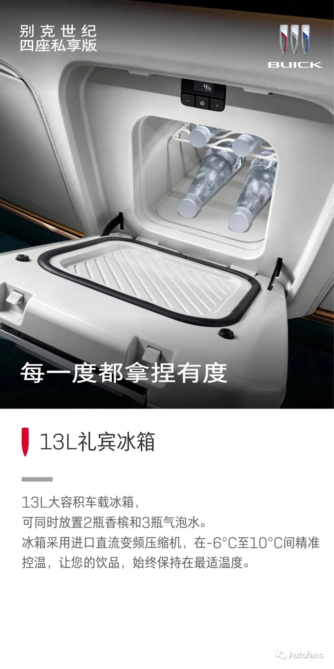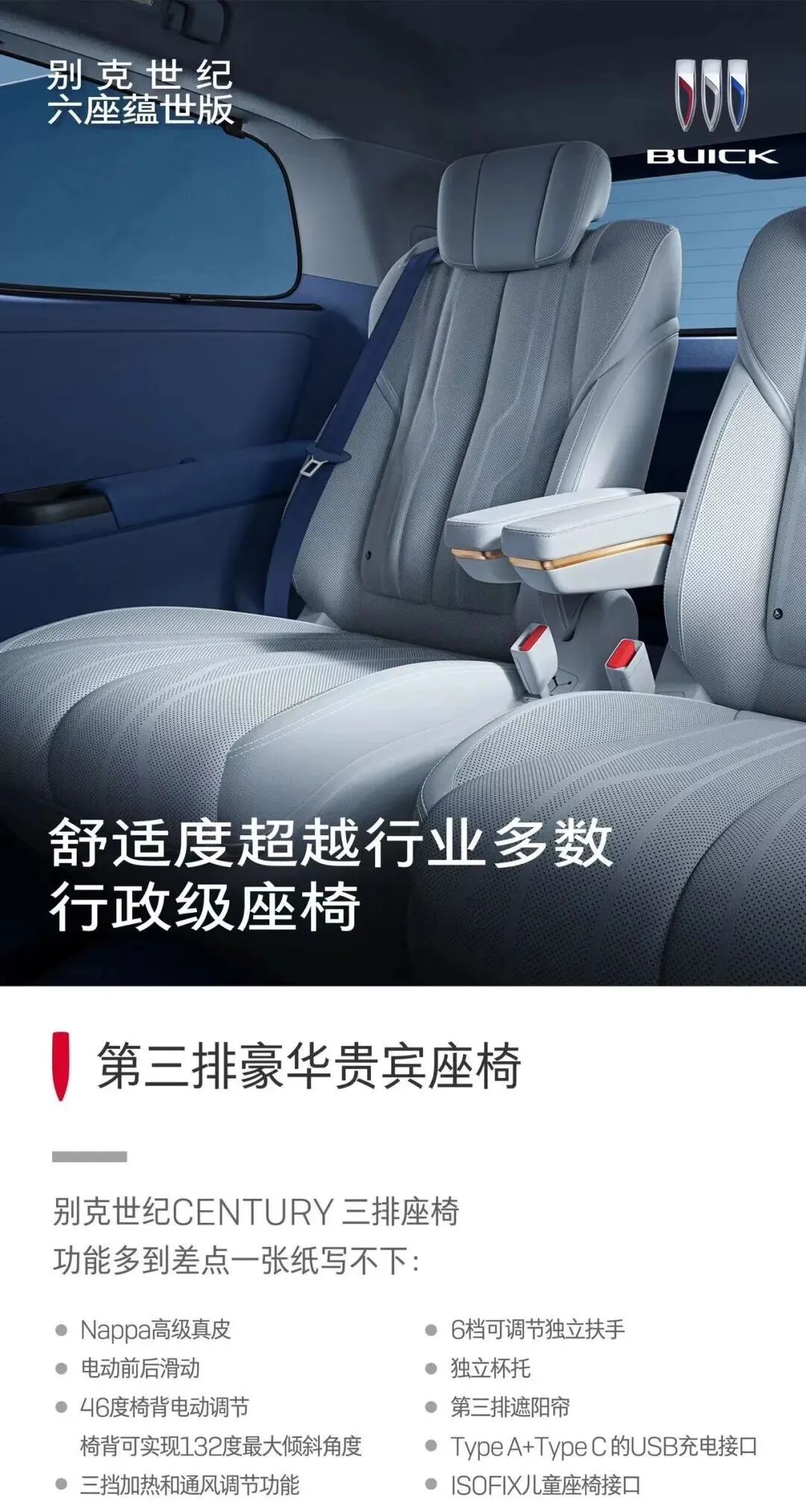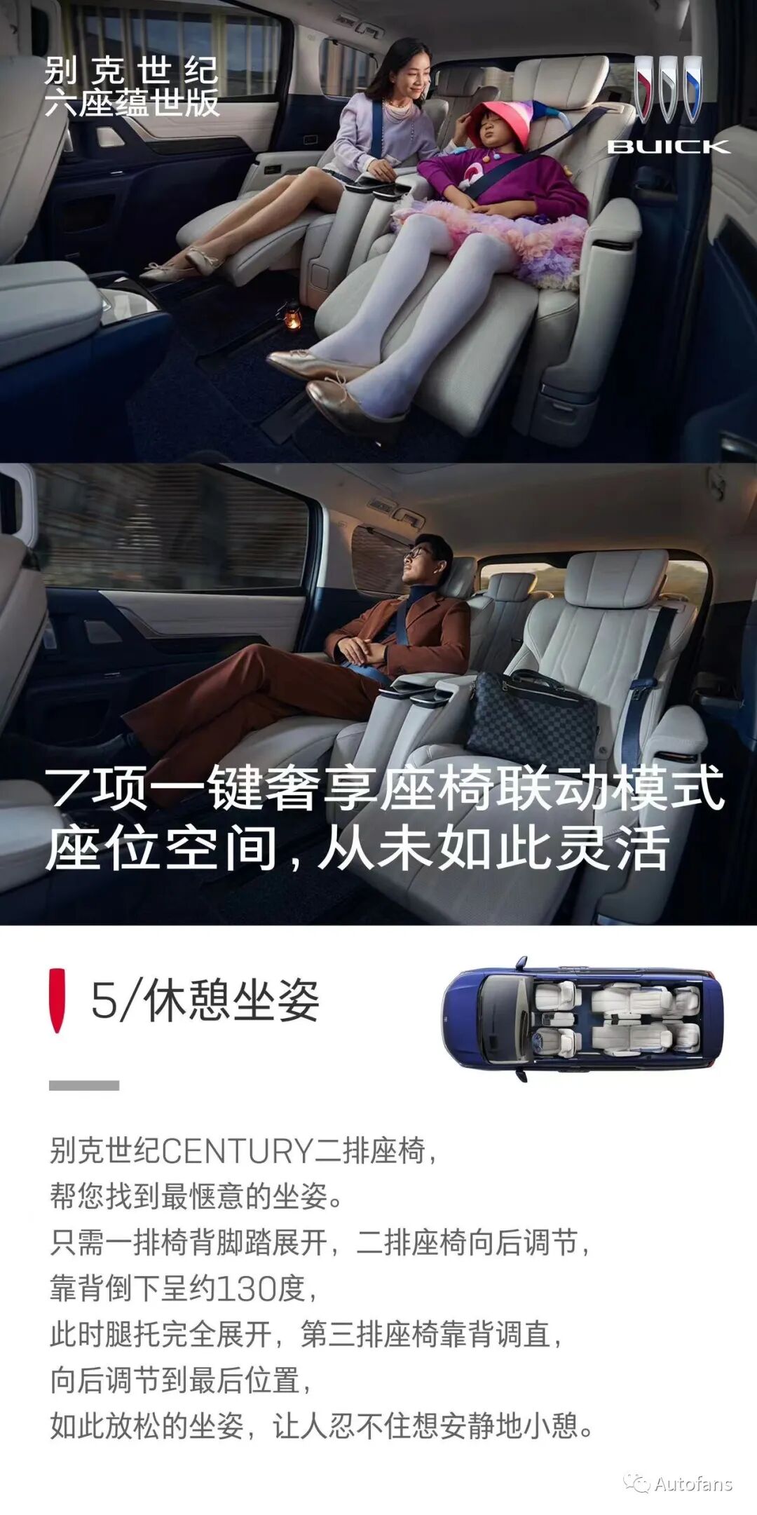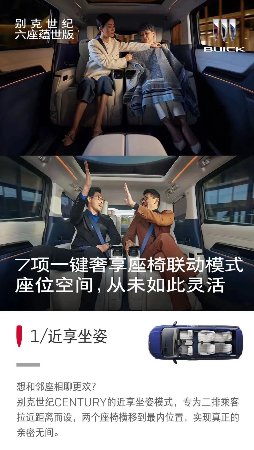 四座私享版开创性地引入豪华智慧幕墙系统,集成了32吋可升降智能屏,仅需一键轻启,标志性的智能大屏就完全升起,将后排座舱升级为奢华与静谧兼备的“私享空间”。该幕墙系统不仅支持多模式智能投屏,并集成了8吋时钟显示屏、Bose音响、13L礼宾冰箱、弹出式大容量储物箱、扩香盒等豪华科技配置,营造出沉浸式的人文智能空间。值得一提的是,别克世纪CENTURY四座车型还提出“云感”理念,带来目前业界功能最丰富的160度云感座椅。超大尺寸的宽体座椅由Fine Nappa半苯胺高级打孔真皮包裹,拥有可延伸式电动腿托和电动翻展式脚踏,延伸后总长度可达616mm。座椅提供18向全电动调节、5大分区加热和18点分区指感按摩功能,其中,颈托和脚踏还采用了石墨烯加热技术,带给乘客如置身云中般的安然惬意体验。此外,新车创新搭载了别克与Bose共同开发的Bose Executive Edition悦尊音响系统,这也是Bose全球首款以后排为优先聆听位置的音响系统,配备有2台数字功放和21个扬声器,其中有16个扬声器布置在后舱,包括后座头枕内置的UltraNearfield超近场扬声器,带来极具音乐厅临场感与氛围感的酣畅听觉享受。