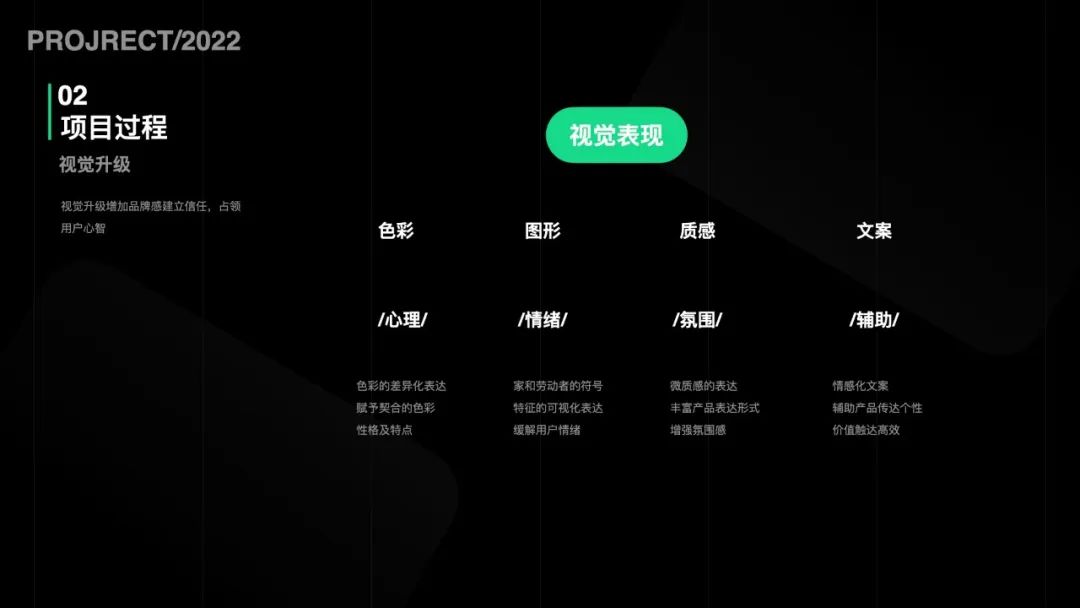 在视觉升级上通过色彩、图形、质感、以及文案四个方面的分析。赋予色彩性格特点,通过准确的图形表达缓解用户情绪,在质感上增加细腻感丰富产品的表达形式增强氛围感。同时情感化的文案也能辅助产品传达个性,让用户触达更高效。