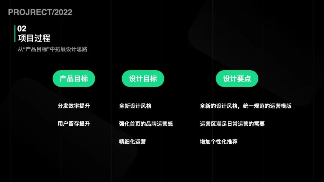 为了更明确改版方向。我们与产品团队多次沟通,明确产品目标。产品的目标无疑是提升整体首页的分发效率&首页留存的提升。团队根据产品目标进行推导,结合设计目标。归纳出设计要点。即打造一个全新的首页设计风格,强化首页的品牌运营感满足精细化运营的需要。并且尝试更多的个性化推荐的服务。