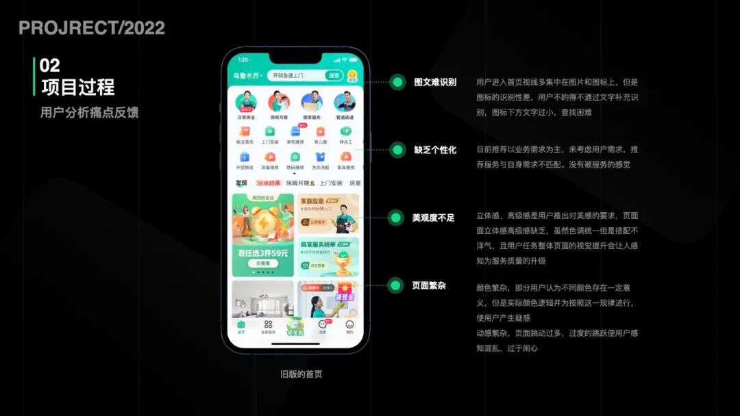 为了更好了解用户的痛点,我们协同用研同学对到家用户进行了用户访谈分析,得出浏览首页的用户主要的痛点集中在图文难识别、缺乏个性化、美观度不足、页面繁杂等。在美观度上立体感和高级感是用户常提出来的美感诉求,同时用户认为整体的视觉提升会让人感知为服务质量的升级。