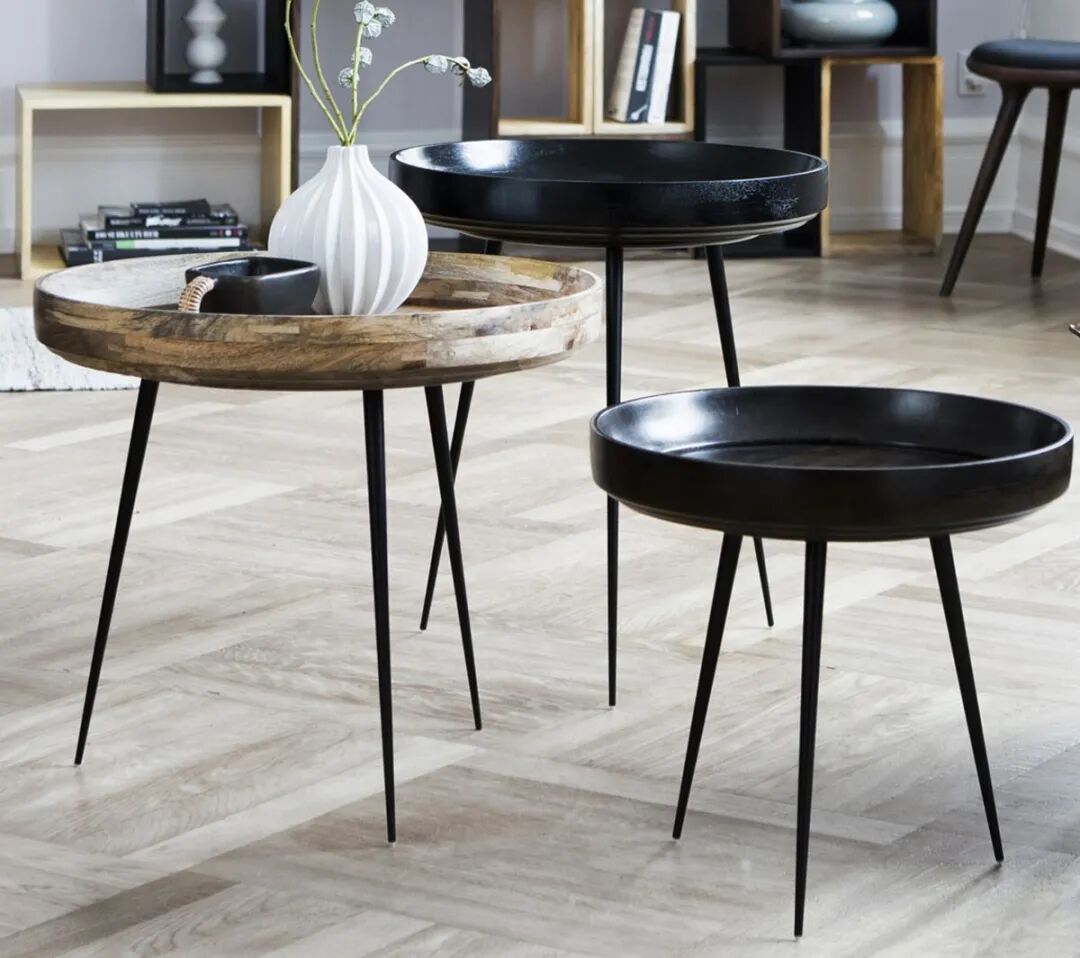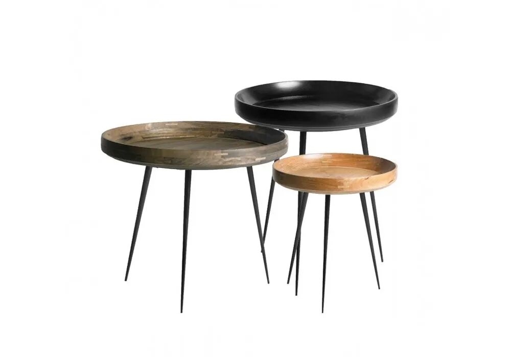 桌子的碗状顶部是用可持续采伐的芒果木在车床上车削而成,并涂有无铅水性 PU 漆。支撑顶部的细长钢腿可拆卸,便于运输和存放。
