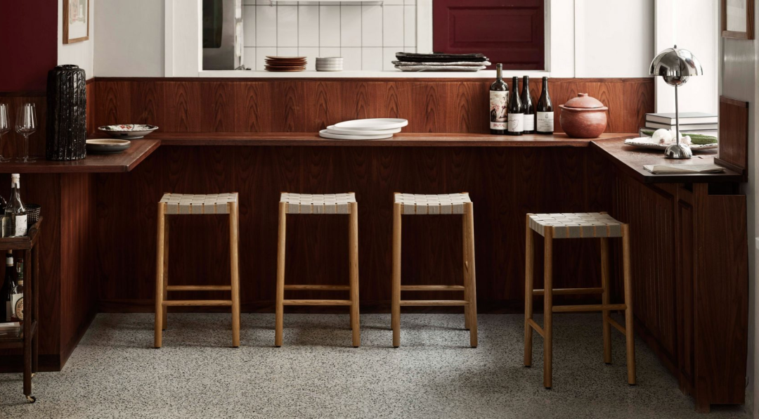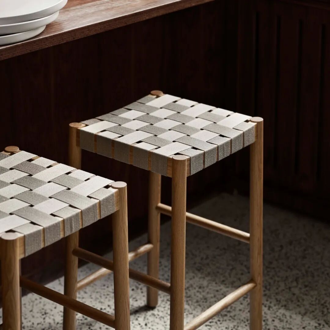 这款凳子以哥本哈根的 Betty Nansen 剧院命名,坚固的框架由漆橡木制成。带蹼的座椅——其肩带由天然亚麻纤维制成并手工编织——提供了一个柔软的缓冲底座。