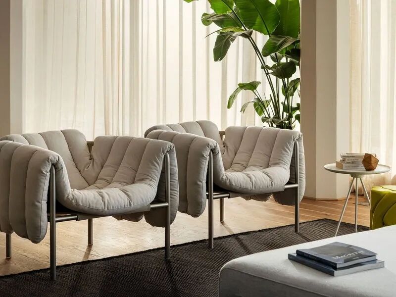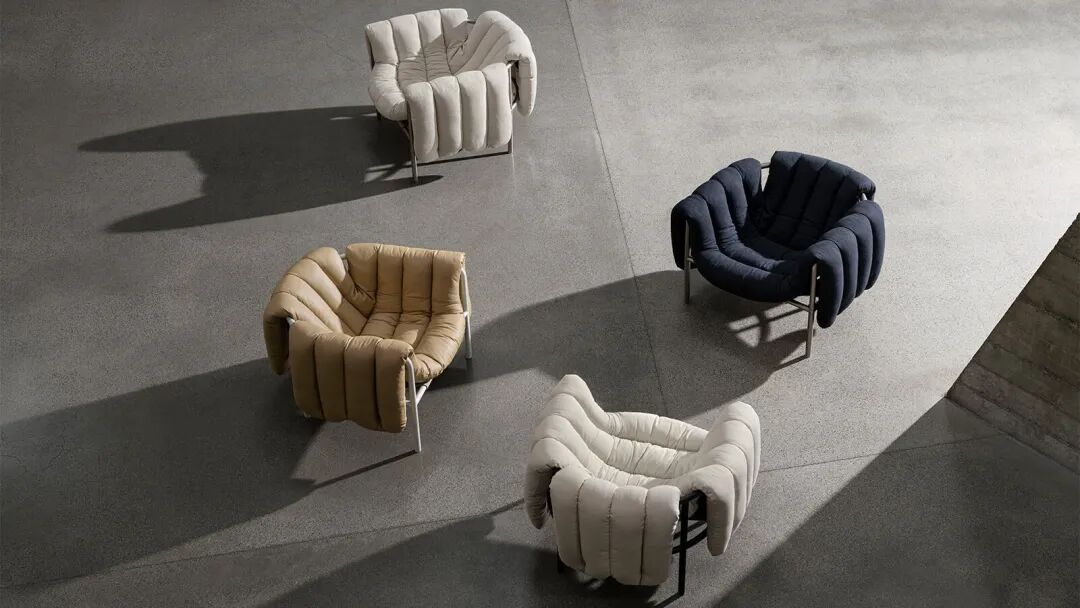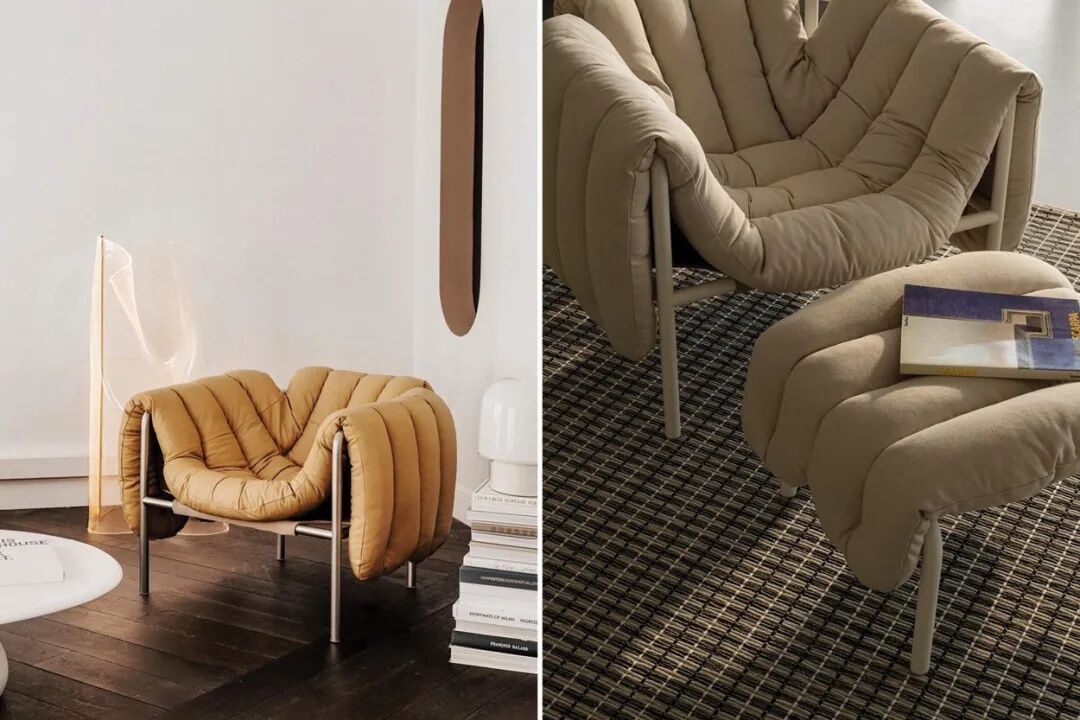 Puffy 休闲椅的可拆卸软垫呈 T 形,较长的部分随意垂在背部,而两个较小的部分则自由悬挂在扶手上。它采用中性色调皮革或厚帆布制成,像被子一样缝制。打造出一把旨在创造“熟悉羽绒被的所有包裹温暖”的椅子。