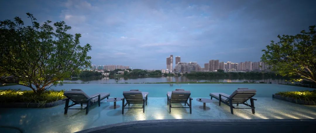 惠州中海·龙湖百贤府开门见湖,坐拥金山湖一线滨湖资源,基于此,园林设计提出“湖语藏心·林隐之境”的设计理念,打造“自然感、酒店感、艺术化、度假化”的现代森居雅奢社区。