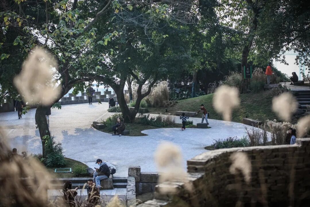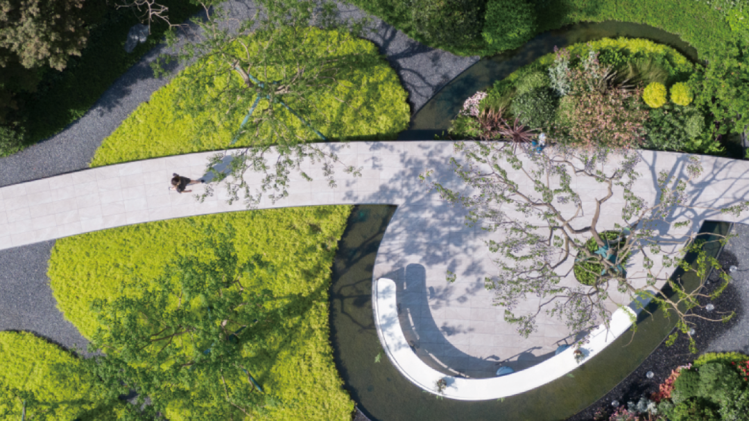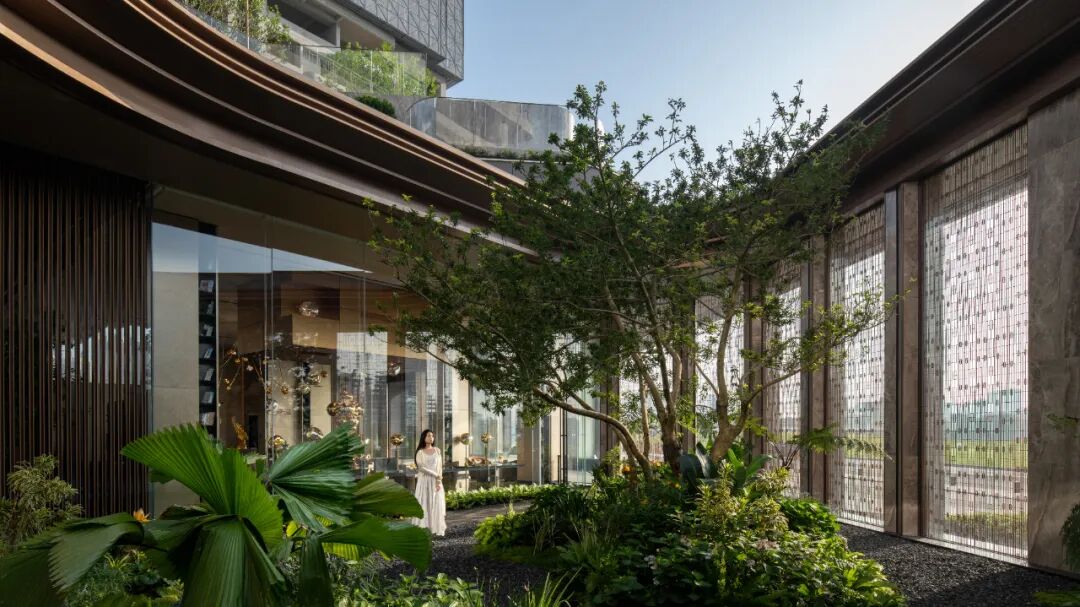 本案为观江樾项目东南街角的示范区,是一个社区生活广场街道,也是展示大区生活的舞台。设计将L形的商业空间设想为都市街角美学馆,设计以“江”为设计概念,将江河的景观延伸至场地,将整个空间打造为充满自然气息的生长型街角花园。