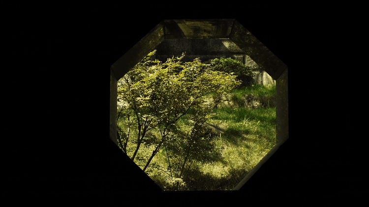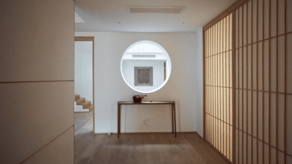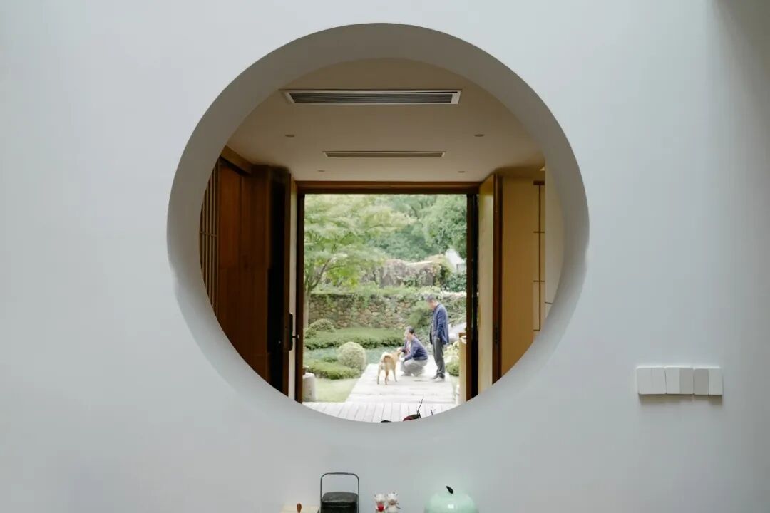 一进门有一个月洞窗。中国的建筑讲究天圆地方,所以从这个窗里看进去,背后的一幅画是方的,倒过来从里往外看,外面的入户大门也是方的,都是圆中带方。