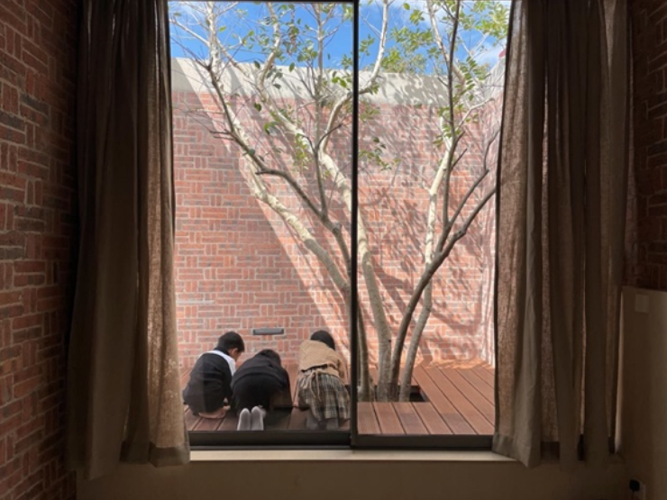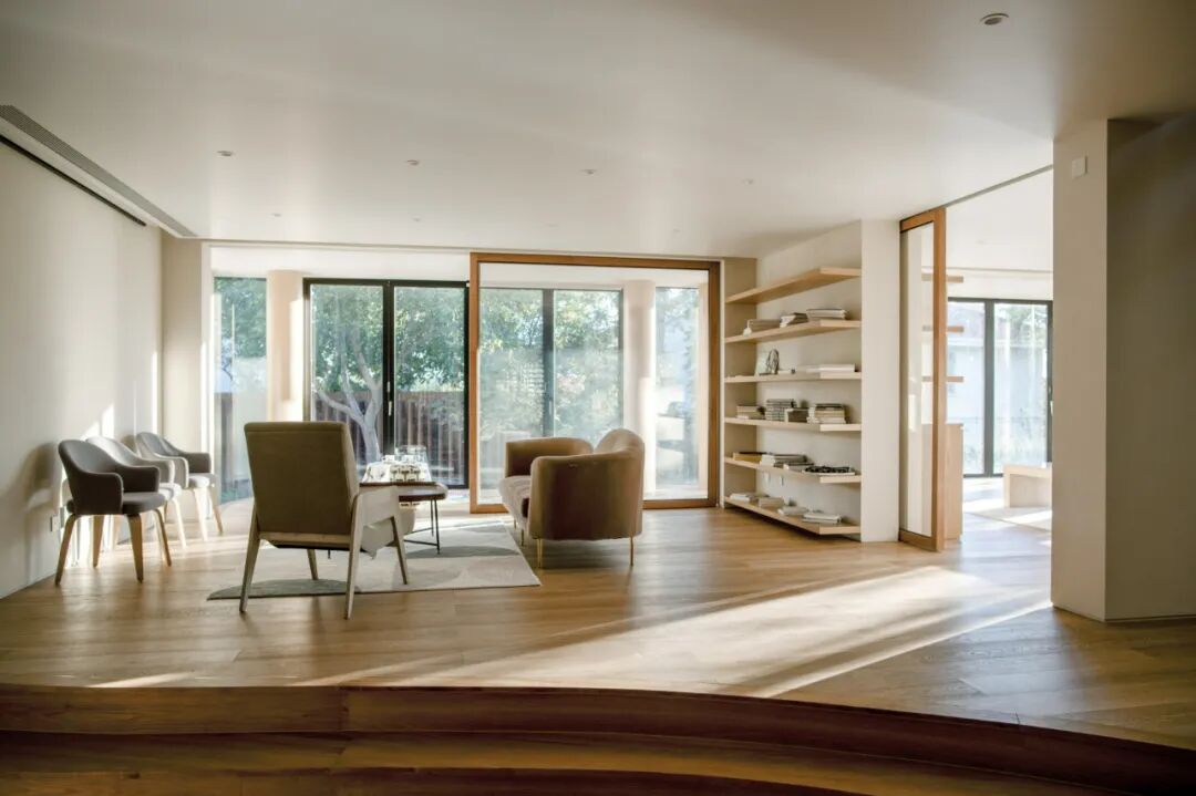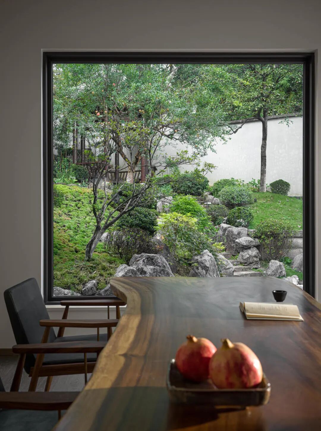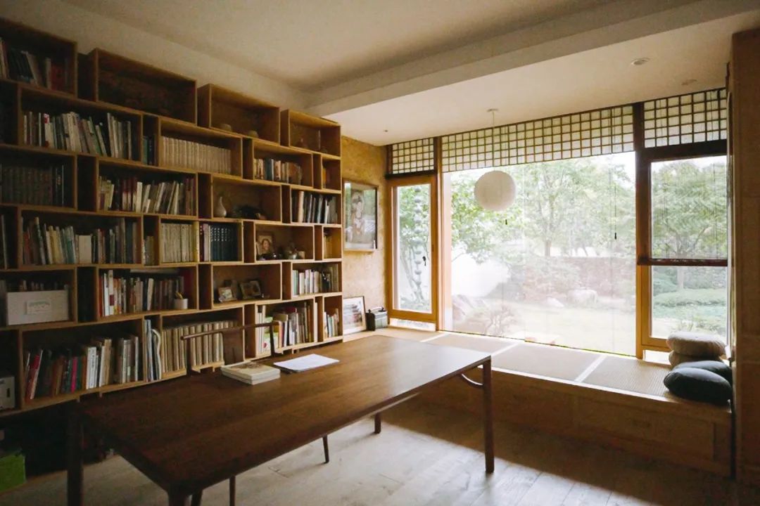 独立的家庭书房在院落西侧,是林先生一家人阅读、绘画、交流的空间,三面开窗,可以望向中庭院落和后山花园。