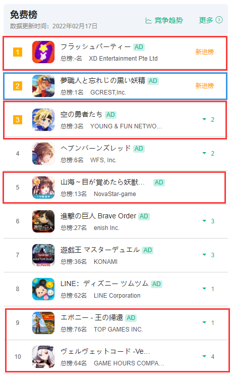 开篇提到的5款产品同屏霸占免费榜Top 10,就出现在2月份的新品潮里。其中,久游的舰娘游戏《拂晓》、星宿科技的《山海》、心动的《Flash Party》,以及B站和日本公司合作研发的《梦职人与追忆之黑妖精》都在相同的档期上线。