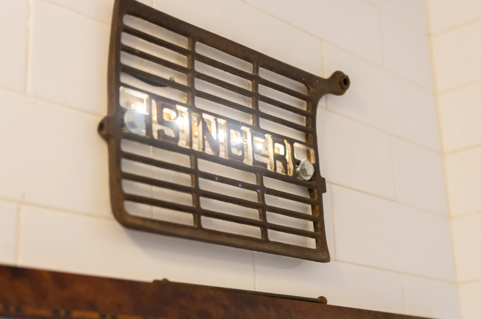 缝纫机的脚踏板被单独拆下,装上灯,嵌在墙上,成了一盏复古又摩登的壁灯。