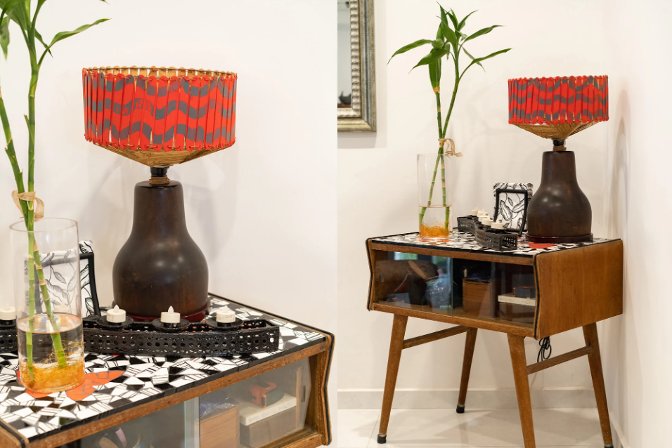 桌上的装饰品,由一个木器和废弃的台灯罩组合而成,颇有民族风,独一无二。