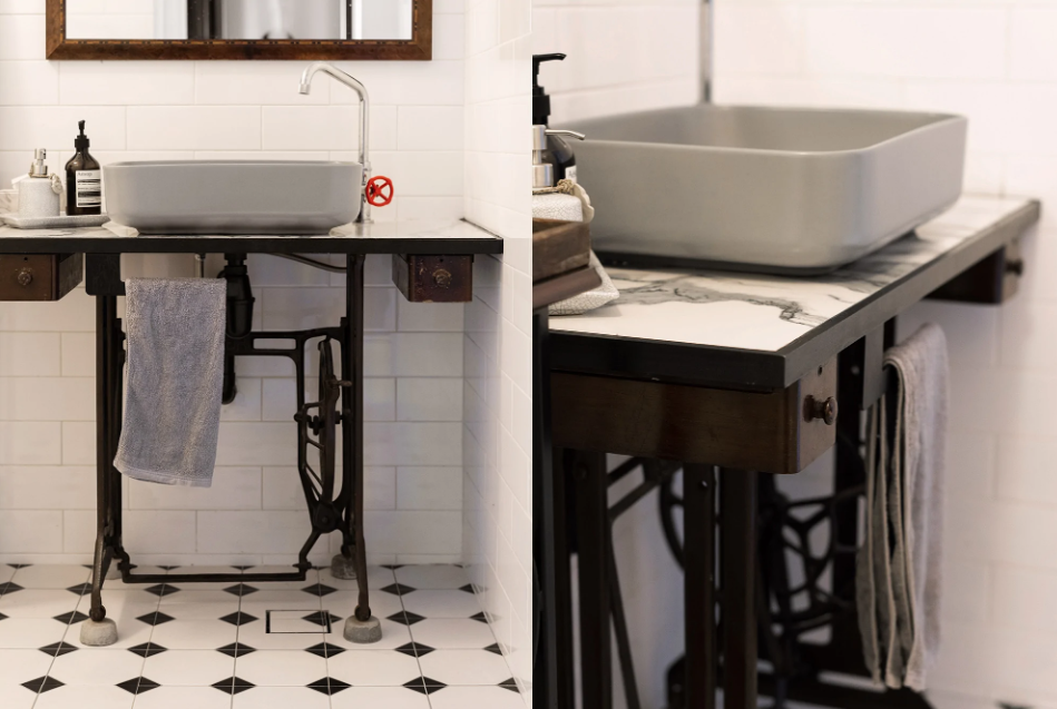 王美颜将母亲留下来的一台老式缝纫机拆开,缝纫机的铁甲与台盆组合,安装上水龙头,就成了洗漱区。