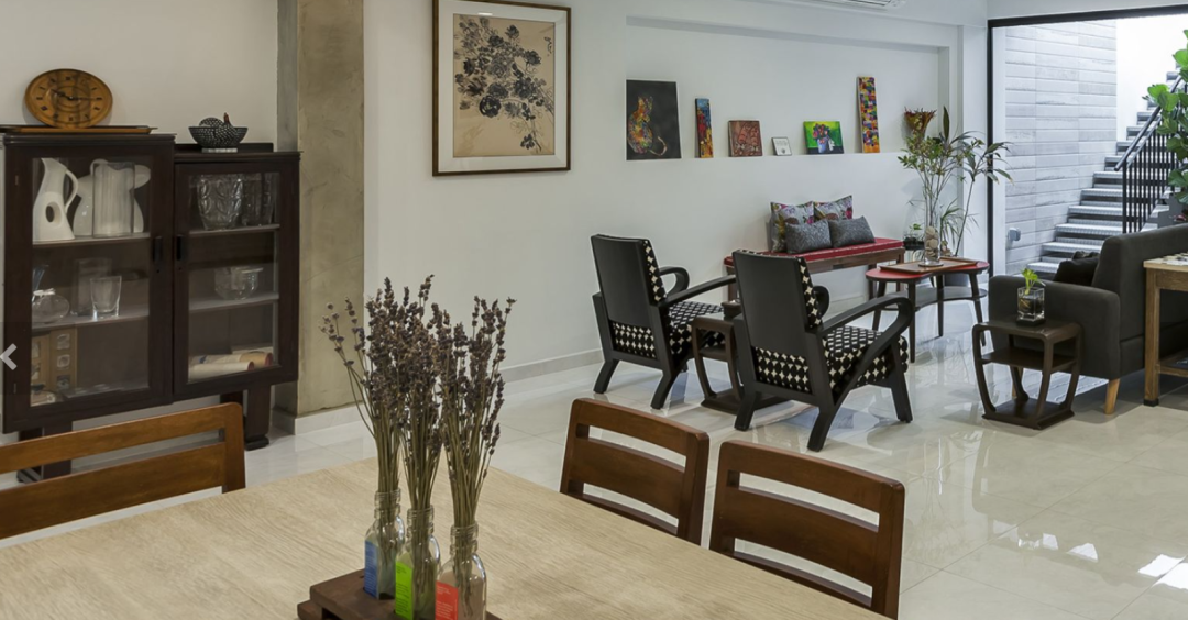 客厅后方是餐厅,餐桌由两张方桌拼接而成,桌椅都是二手家具,看起来十分质朴。