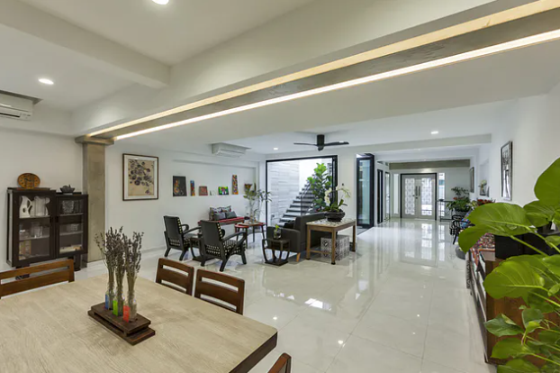 从前院进入,可以看到一个略显空旷的家,设计简单,白色地砖、白色墙面,装饰不多。