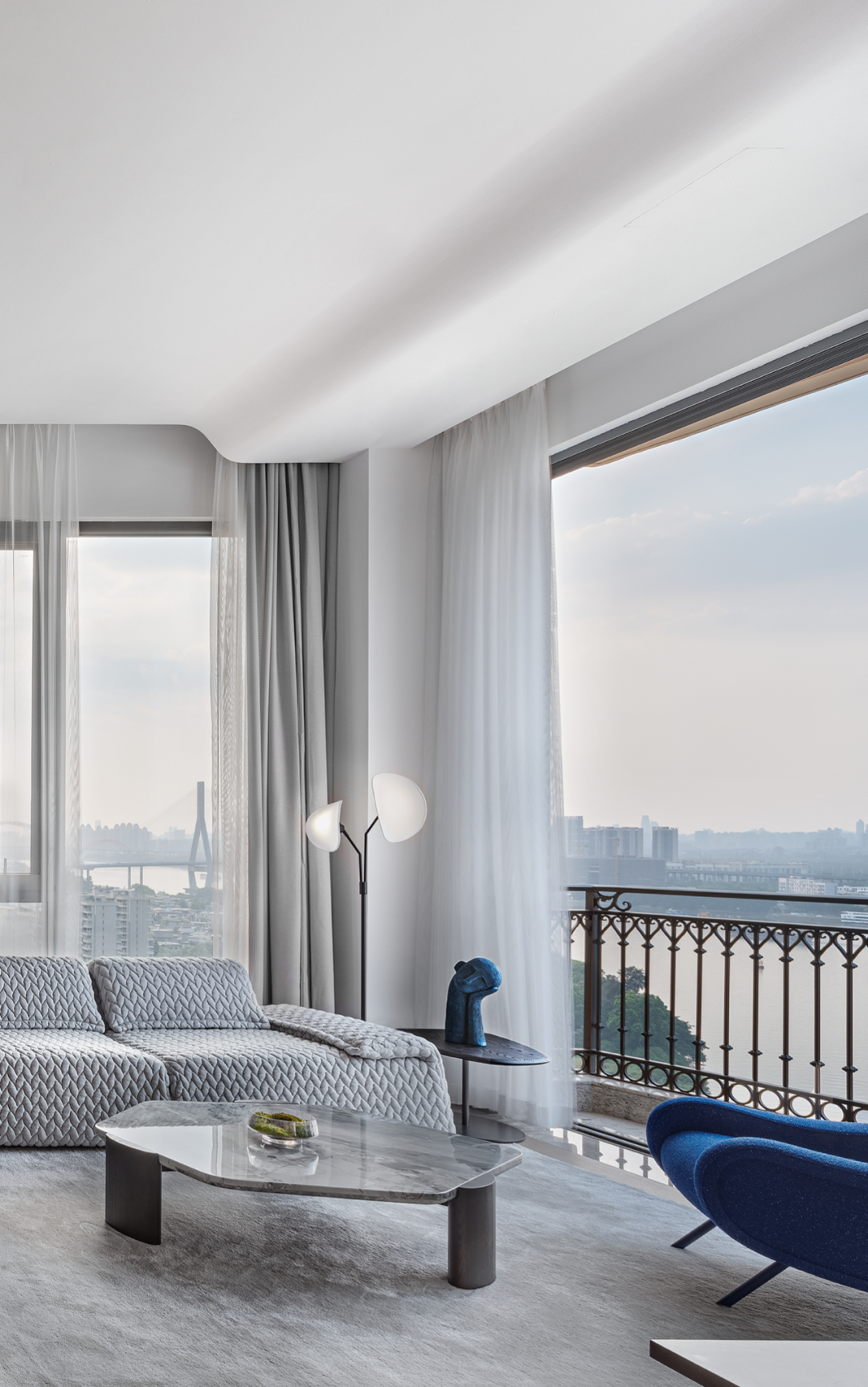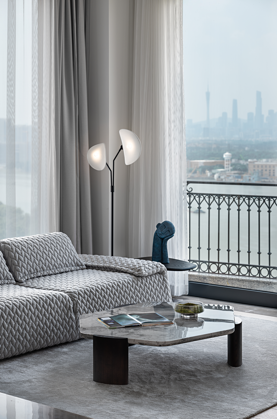 一面墙体的留白,凸出室外景观与室内空间的合力,大尺度彰显了空间的极度张力和视觉冲击力,而无形力量塑造的流动,串联场域的秩序,打造生活与自然的有机融合。
