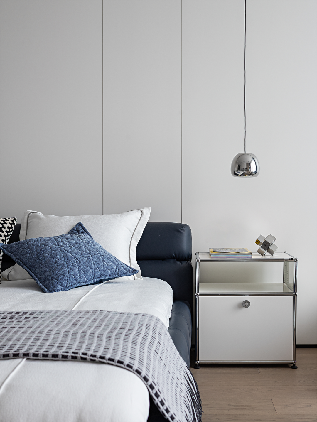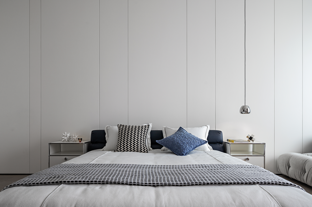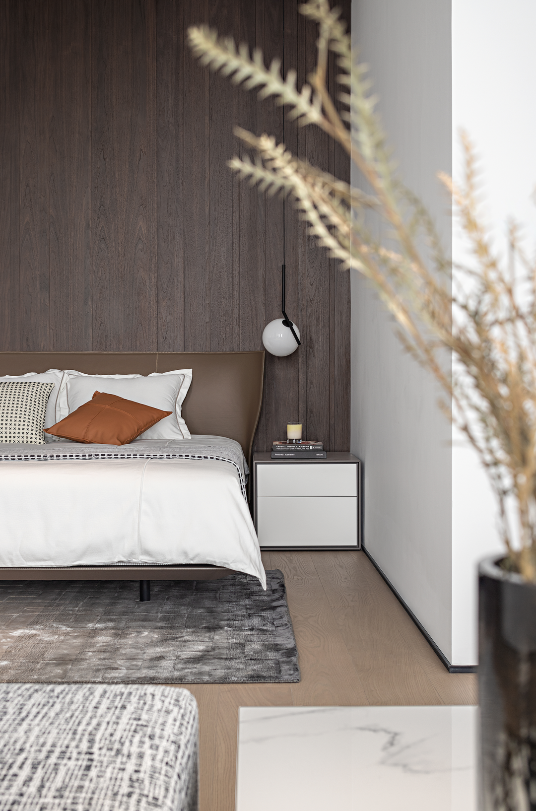 空间环境与心情是辅成的过程,主卧视野非常开阔,设计以沉稳安静为关键词,温润的元素,合理光线创造舒适的睡眠环境,通过材质的运用和生活方式的结合,从触觉的舒适来提升温馨感。