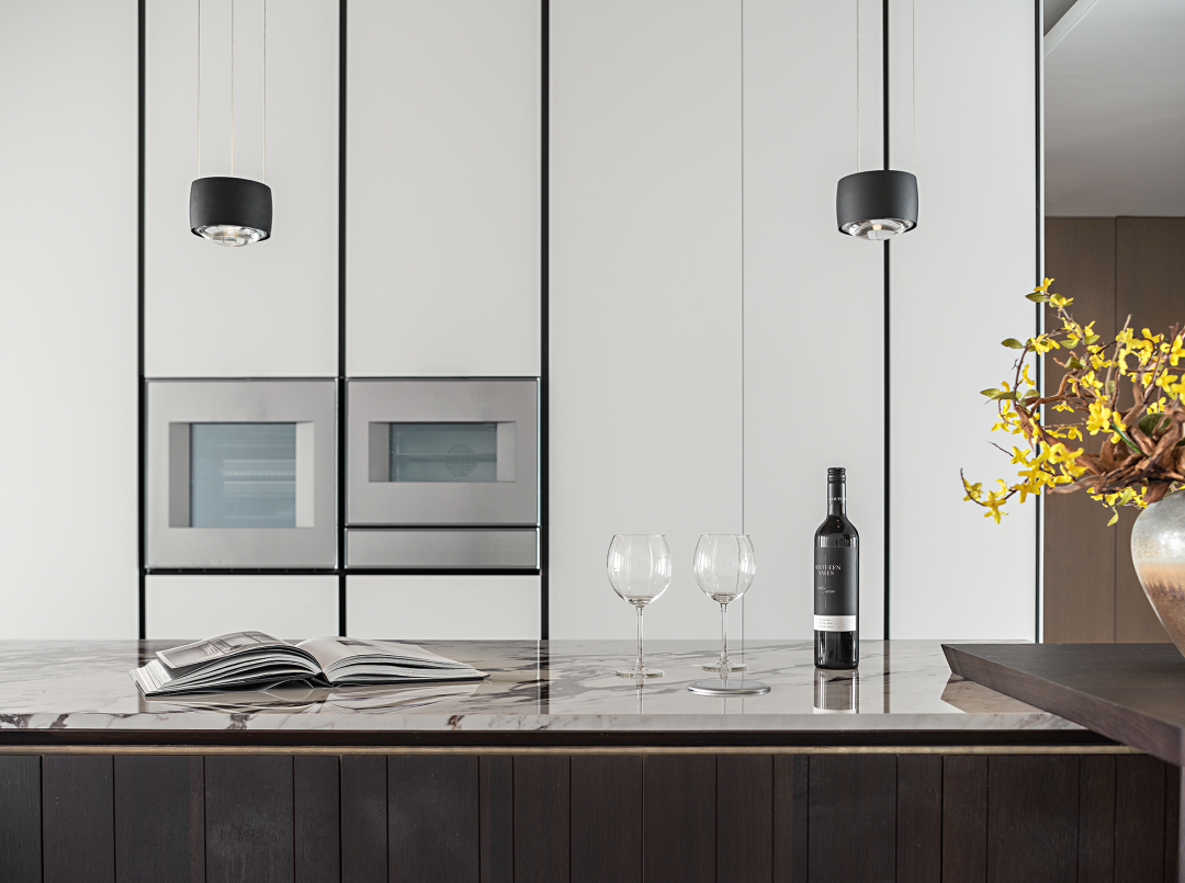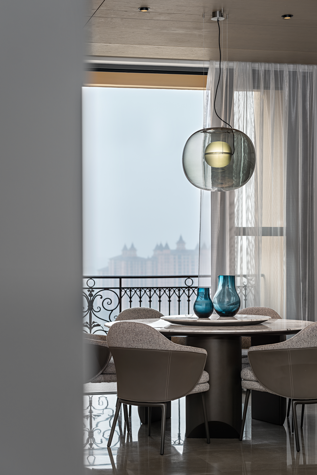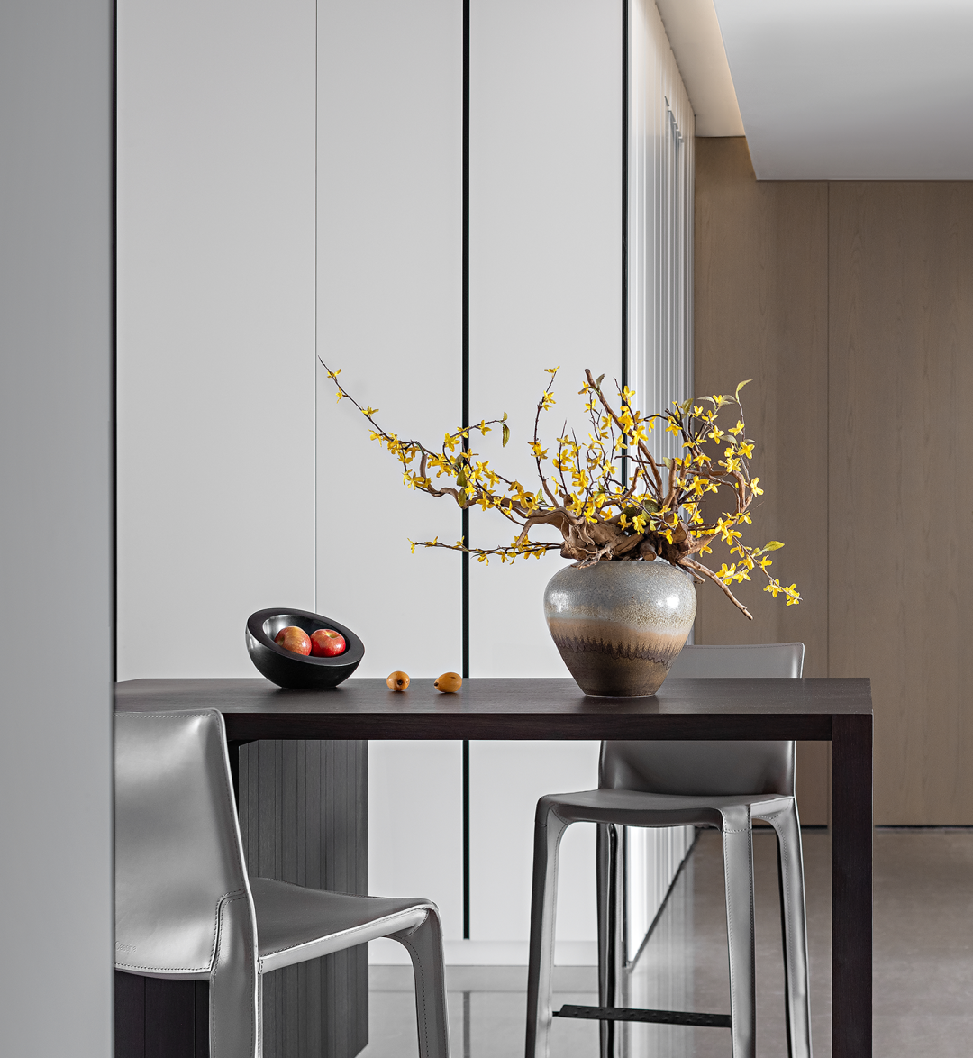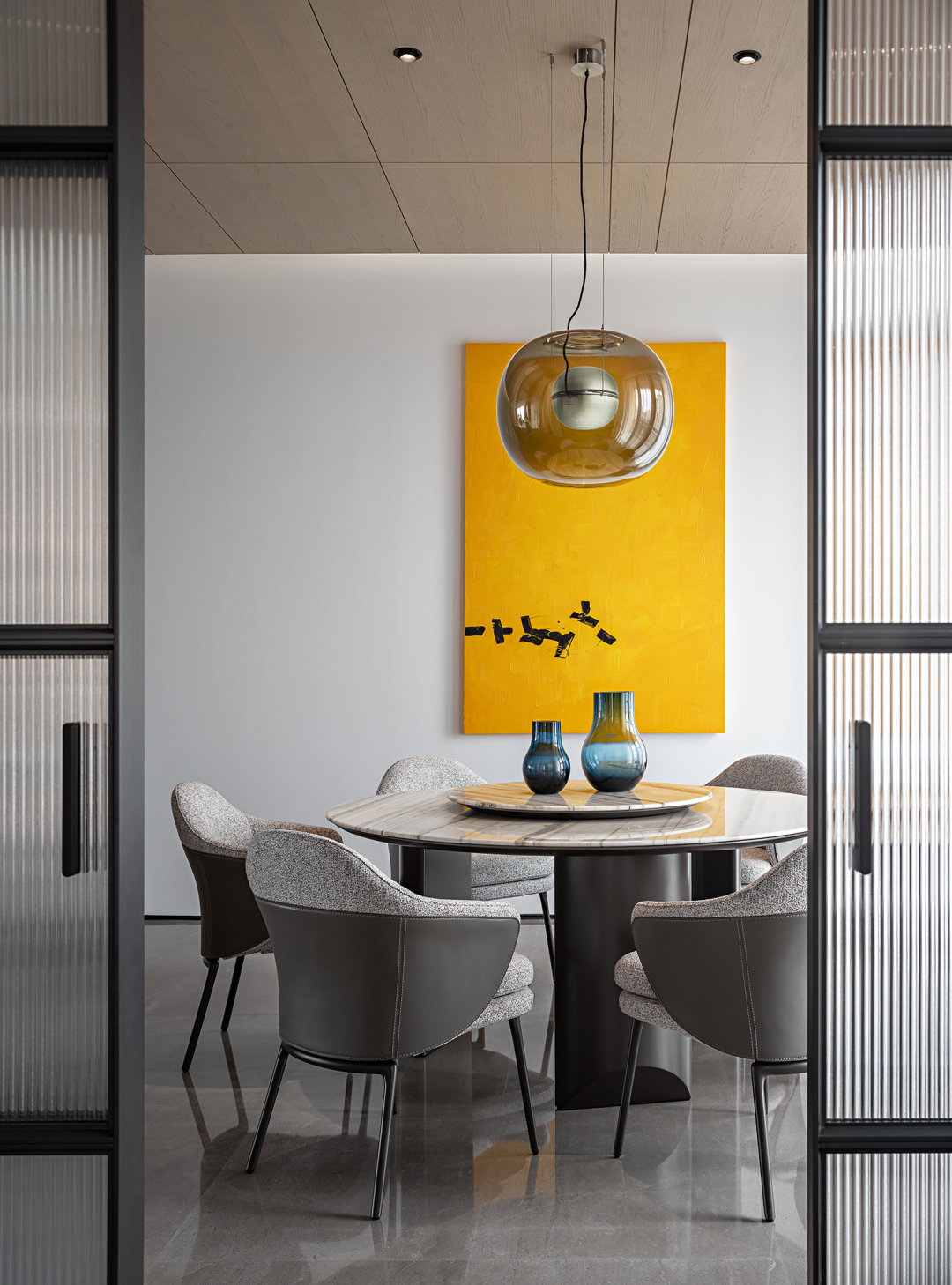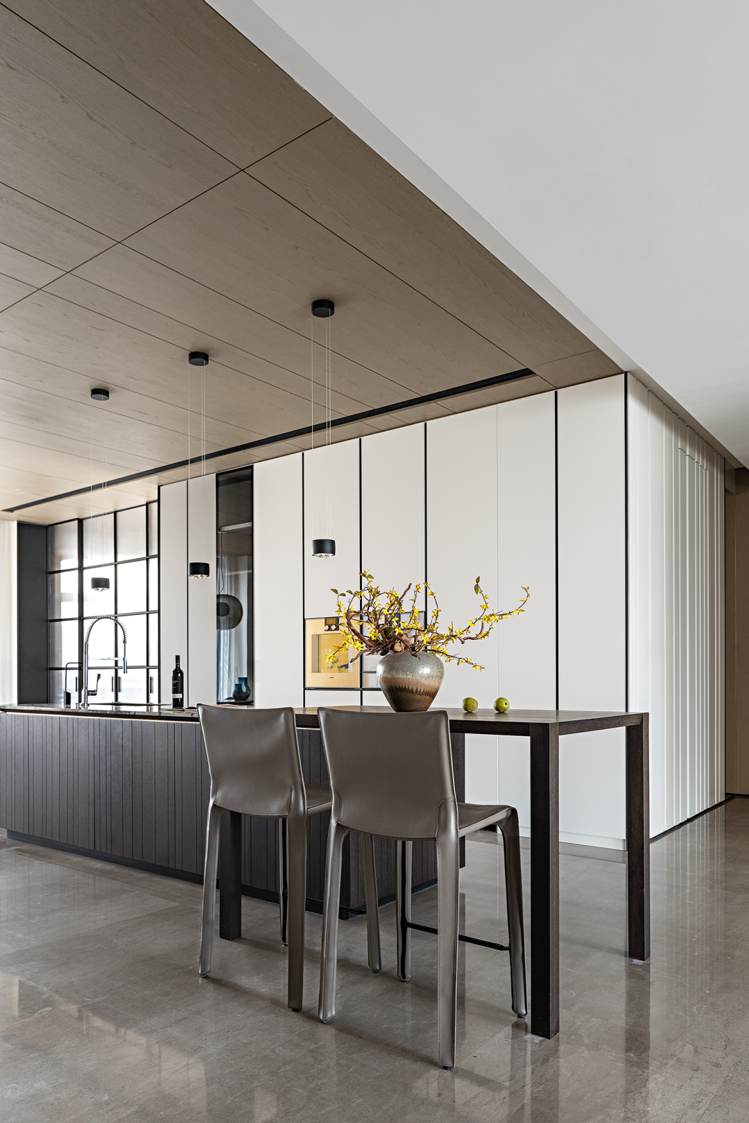 这里不仅是日常起居的体现,也是家庭成员相聚的空间,既满足了家人或朋友聚餐的需求,也给日常就餐满满的仪式感,设计将美学的感性和空间质感做了最完美的平衡,于觥筹交错间享受这宁静的港湾。