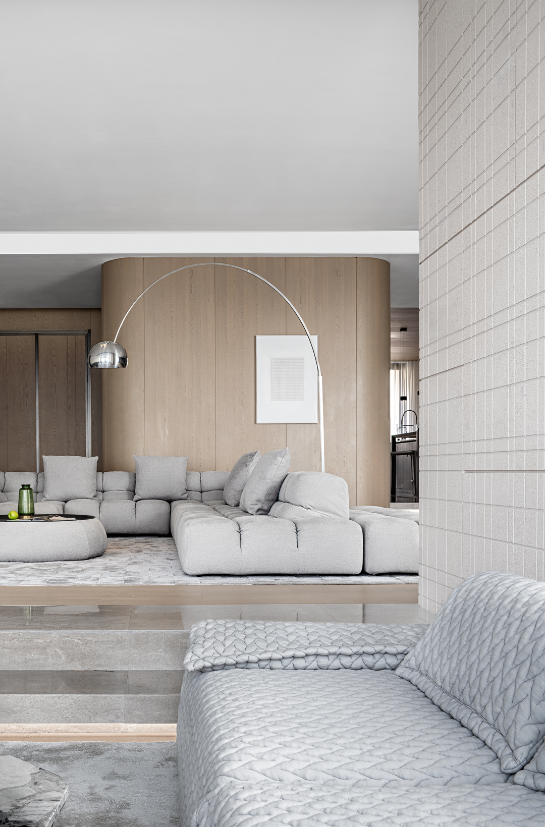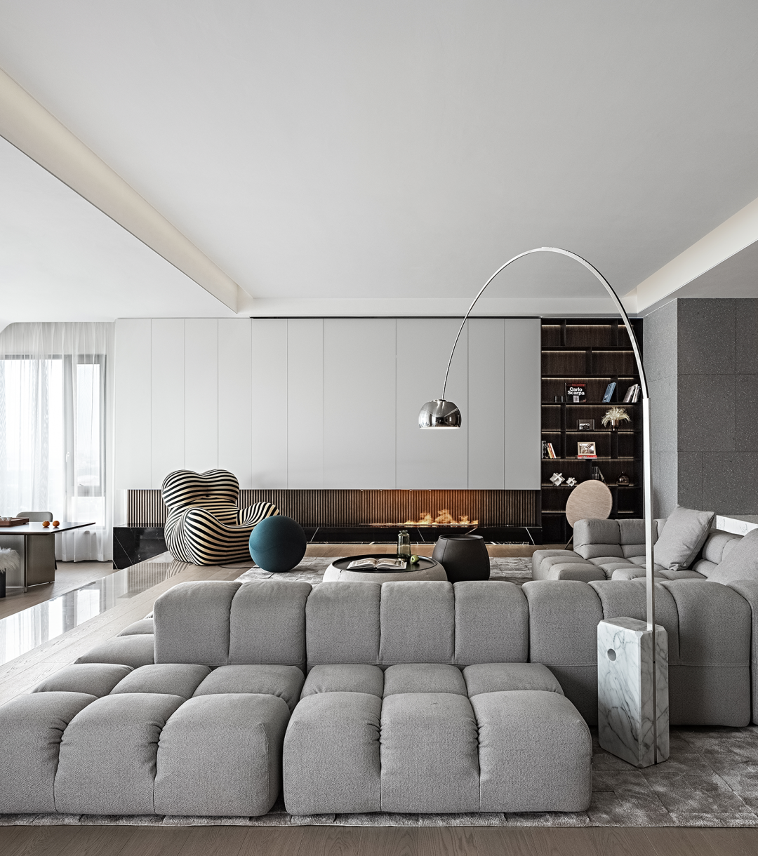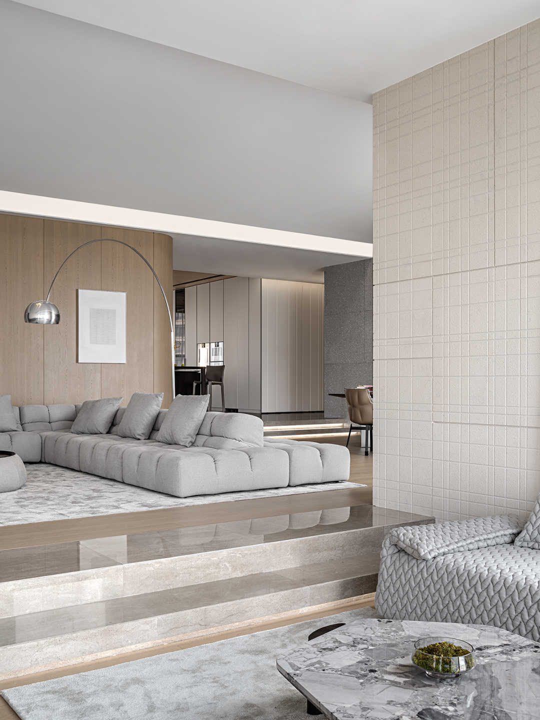 客厅主色调为灰色的橡木饰面,再晕染深蓝色和暖黄色做色彩调和,平衡内部与室外的亮度,不规则的大理石表面处理,映衬着一些艺术装饰,简约随性,吐露生活的细节与精致。