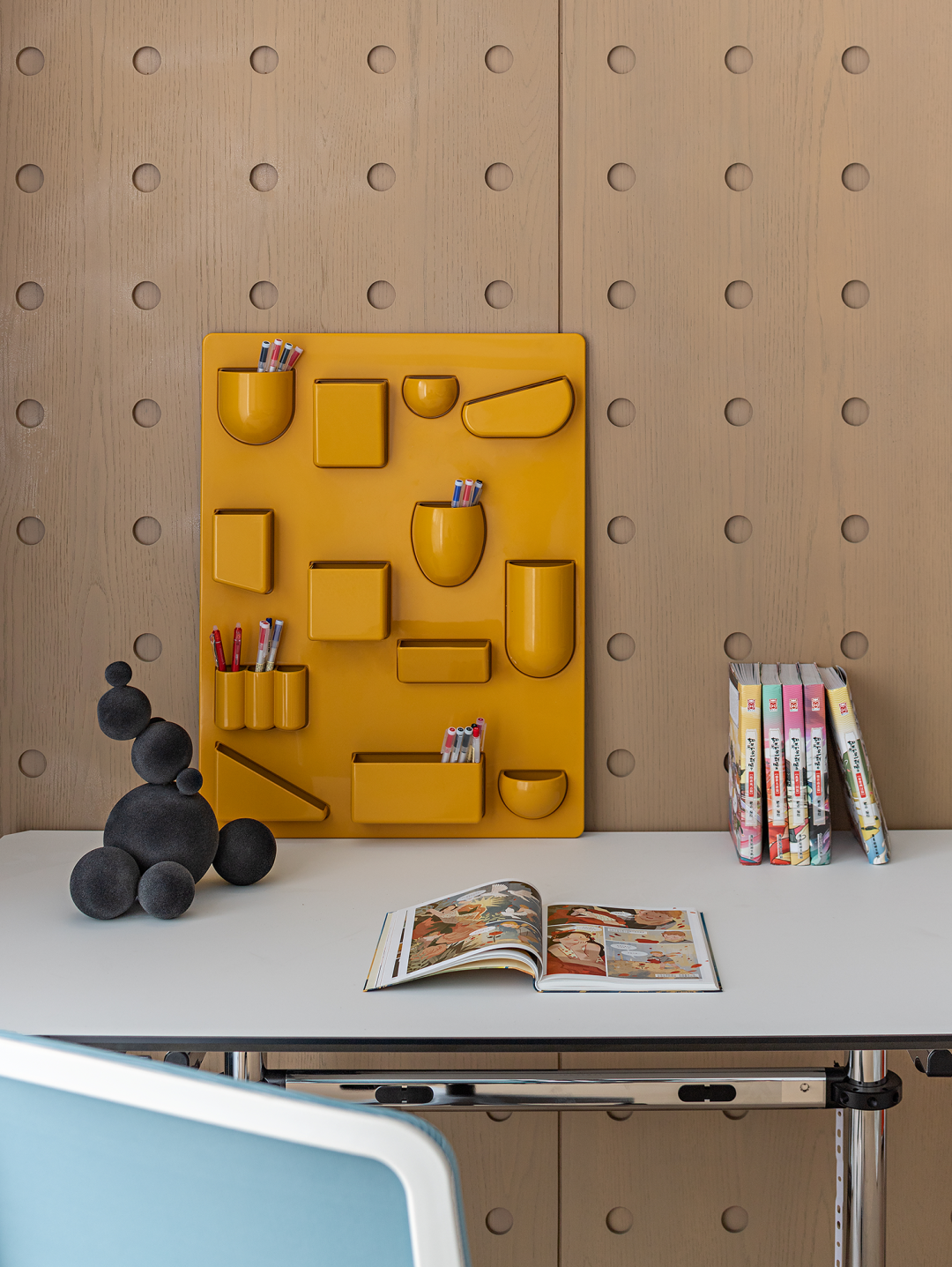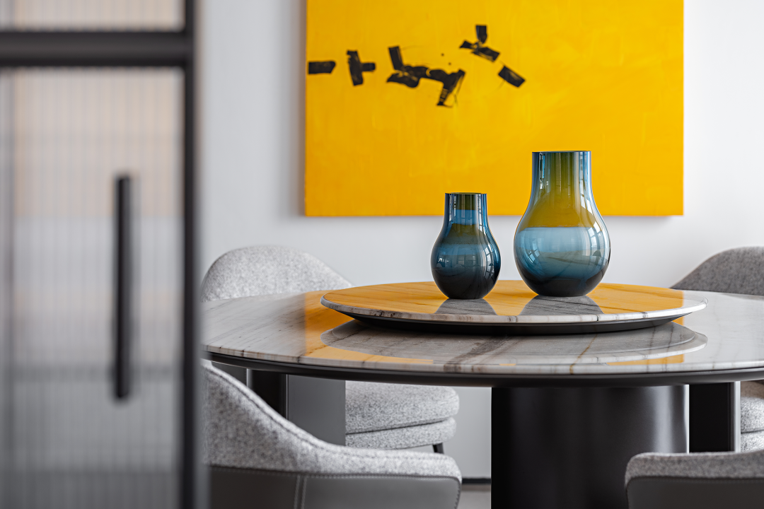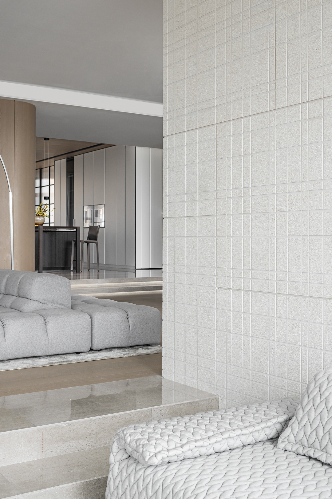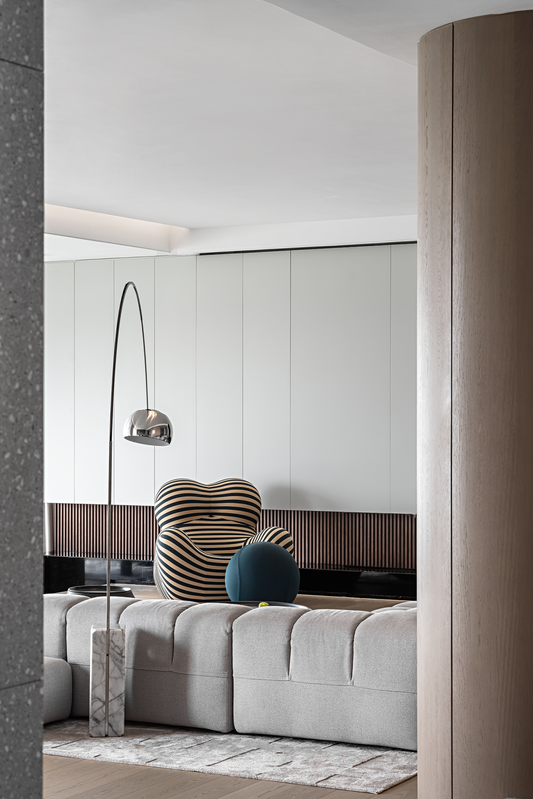 客厅主色调为灰色的橡木饰面,再晕染深蓝色和暖黄色做色彩调和,平衡内部与室外的亮度,不规则的大理石表面处理,映衬着一些艺术装饰,简约随性,吐露生活的细节与精致。