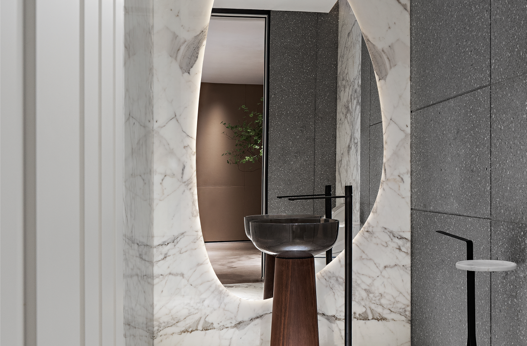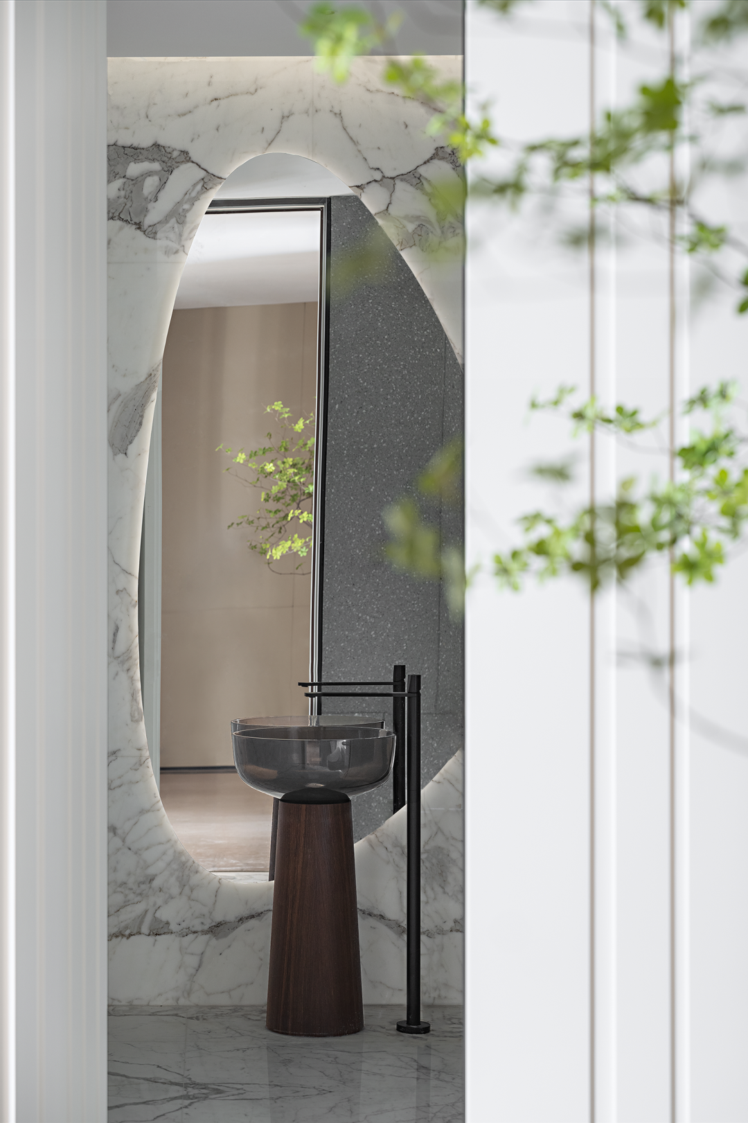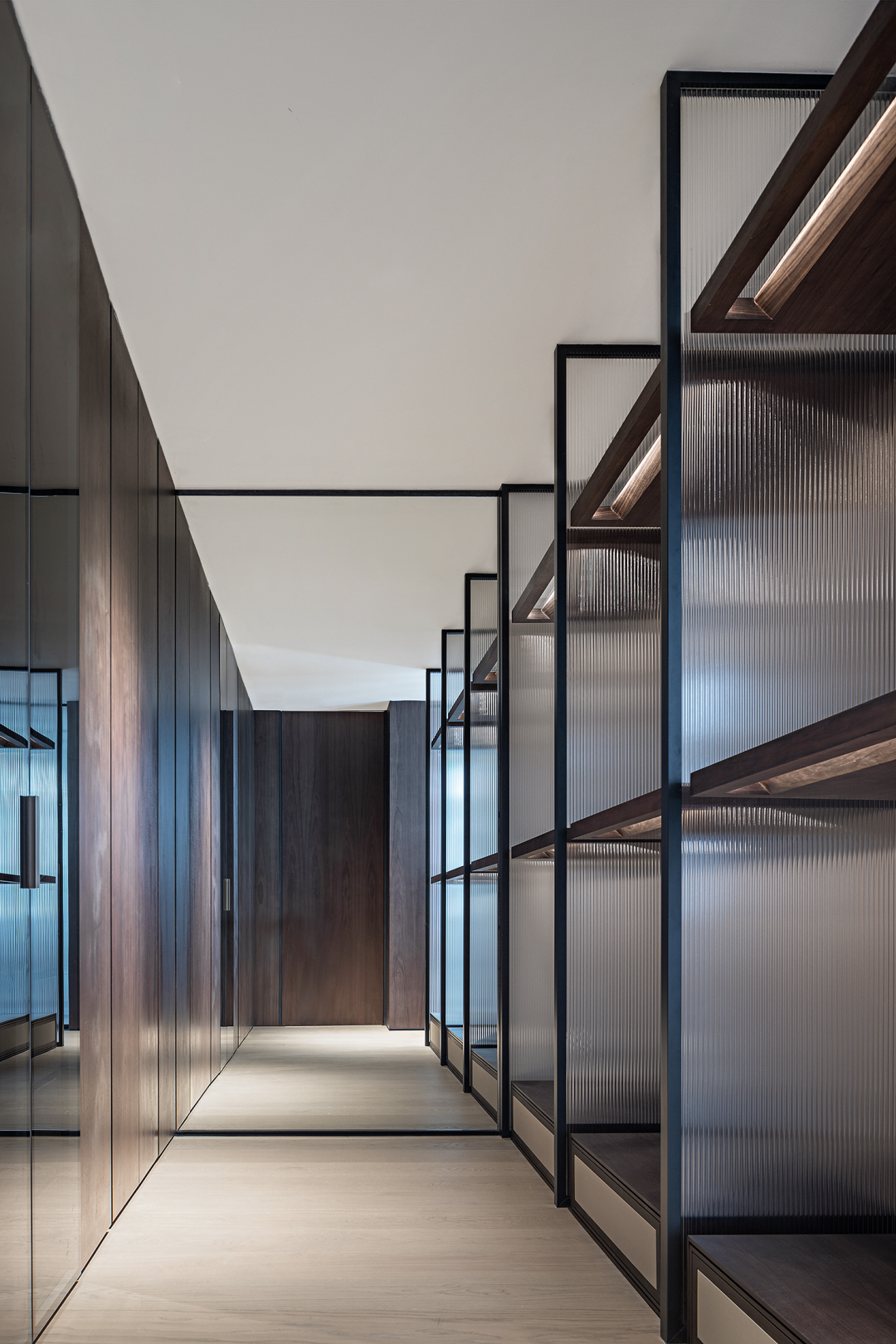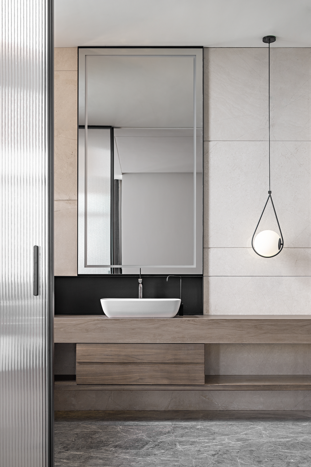 主卫和衣帽间使用了大量的金属和玻璃元素,和对称式布局,予人朴素而灵动的生活体验,清晰可见的纹理,增强了空间自然沉稳的气质,同时也让居者的心情更加沉静。