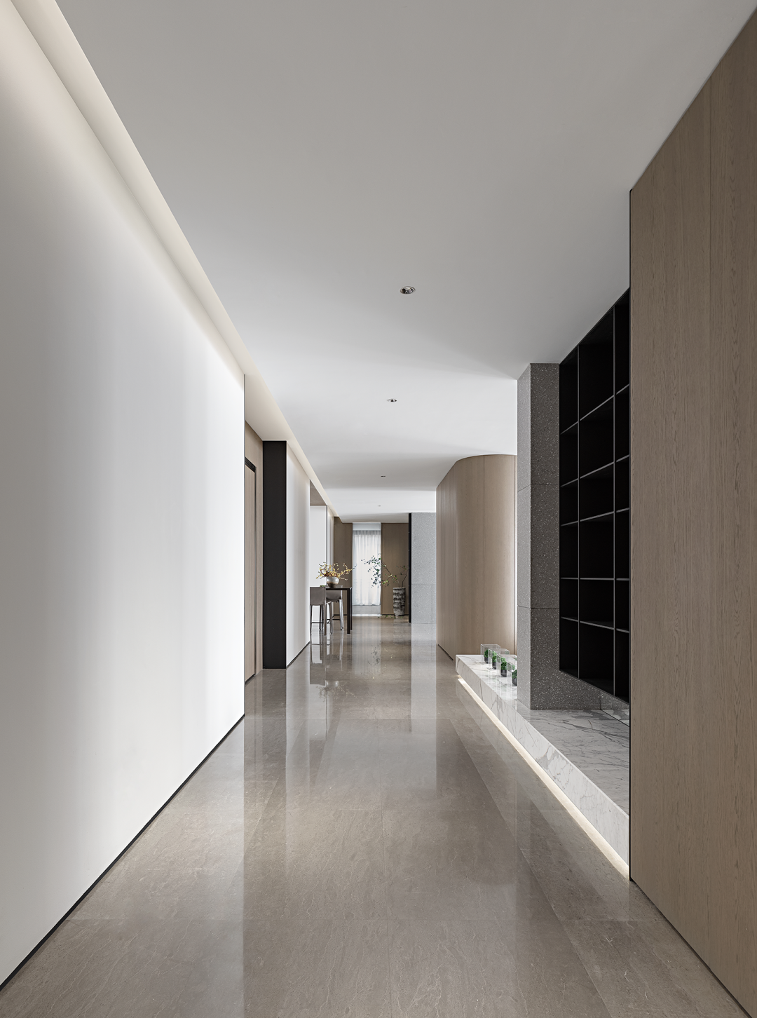 通道将各功能区分隔,呈现出宁静沉稳的氛围,墙体采用圆润的手法,既合理利用了空间尺度又保持了美观度,灰色的橡木饰面和建筑体融合,派生出灵动感,侧面展现了居者的生活品味。