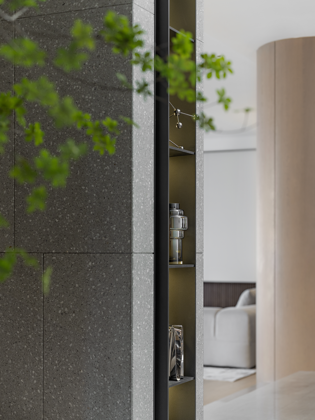 入户要有仪式感,推门见厅,不仅是视野的开阔和使用的便捷,更是一种纯粹的艺术表达,在这里仿若身处大自然,肆意潇洒的氛围油然而生,不规则的艺术摆件和生机盎然的绿色植物,生出一番趣味艺术之感。