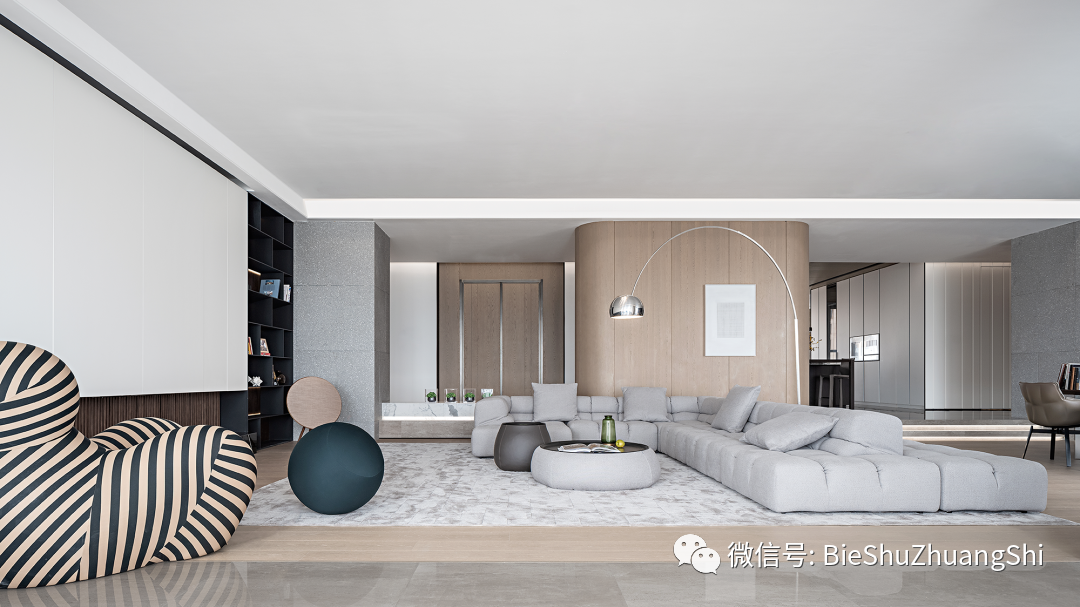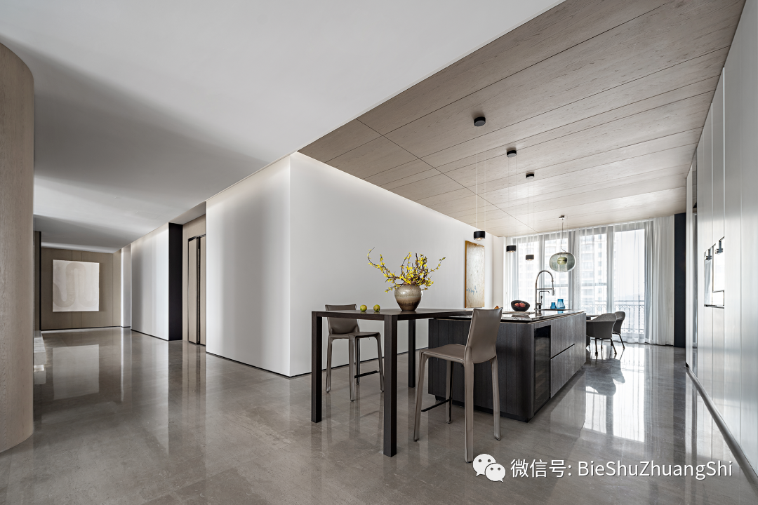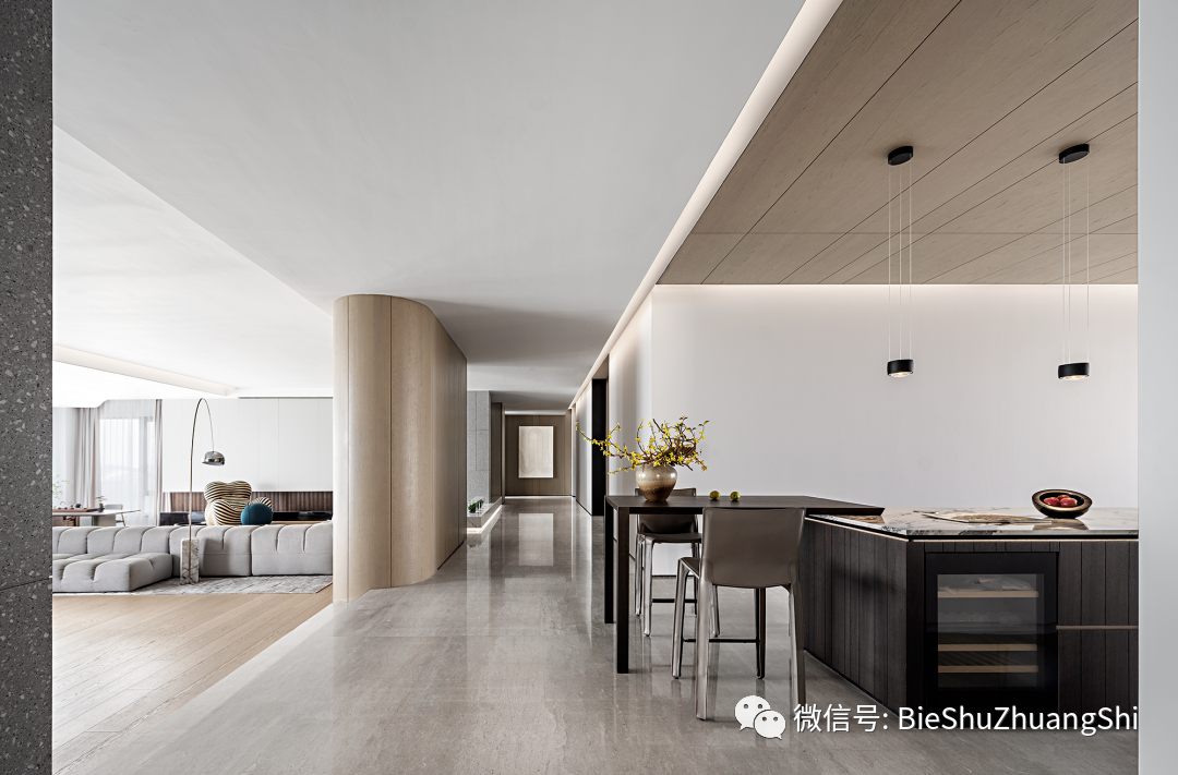 通道将各功能区分隔,呈现出宁静沉稳的氛围,墙体采用圆润的手法,既合理利用了空间尺度又保持了美观度,灰色的橡木饰面和建筑体融合,派生出灵动感,侧面展现了居者的生活品味。