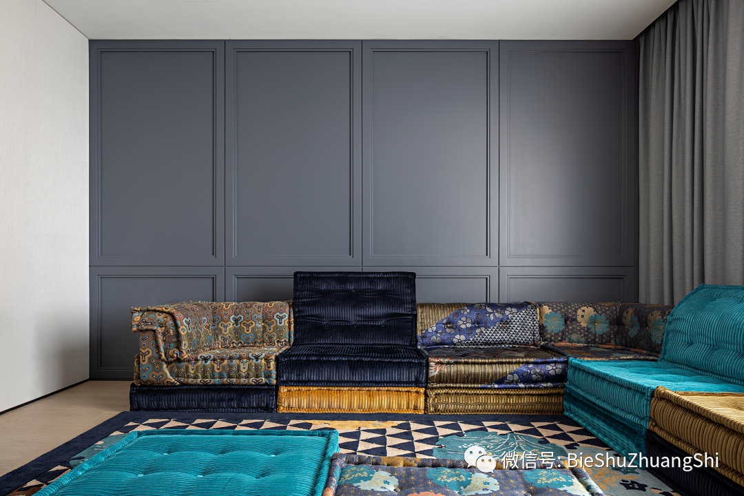 多功能娱乐室实现了居者纯粹的艺术审美,丰富了其对精彩生活无限的向往和热爱的不懈追求,错落有致的沙发形成高低差,不同色块的对撞和融合,不仅勾勒出空间的各同形态,而且让情感的互动和交流得以随时产生。