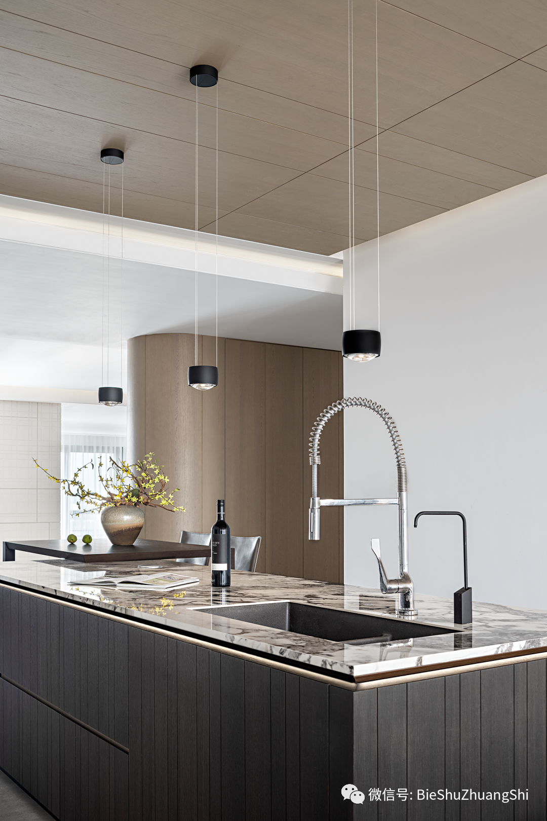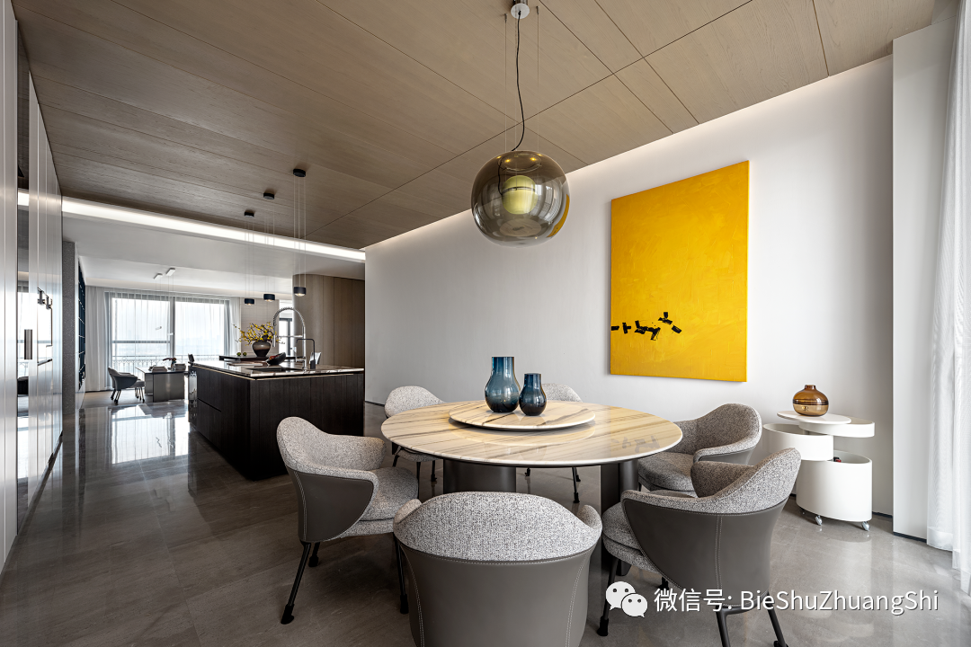 这里不仅是日常起居的体现,也是家庭成员相聚的空间,既满足了家人或朋友聚餐的需求,也给日常就餐满满的仪式感,设计将美学的感性和空间质感做了最完美的平衡,于觥筹交错间享受这宁静的港湾。