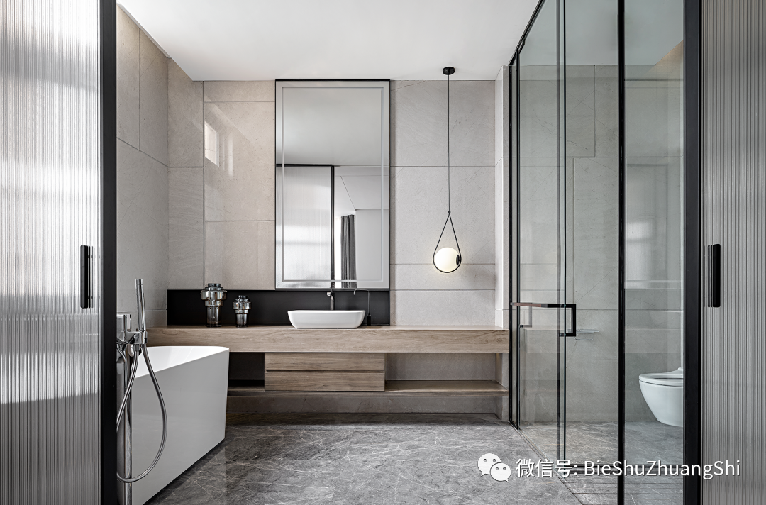 主卫和衣帽间使用了大量的金属和玻璃元素,和对称式布局,予人朴素而灵动的生活体验,清晰可见的纹理,增强了空间自然沉稳的气质,同时也让居者的心情更加沉静。