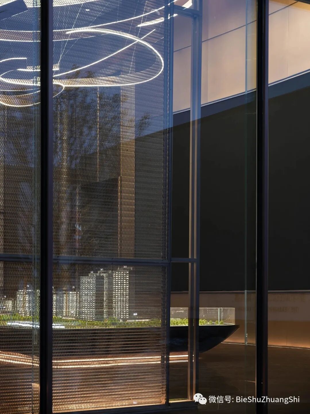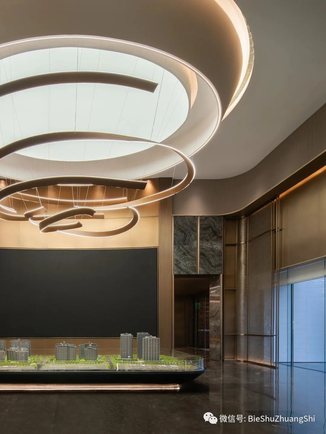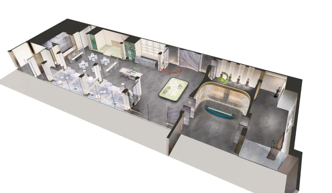 设计的尺度是展开叙事的艺术,通透采光性强,互为映照挑高的楼层电子屏区域、整洁大气的布局,而不规则的列阵,萦绕于沙盘四周增强空间纵向感象化的语境,刻画了建筑空间的艺术美