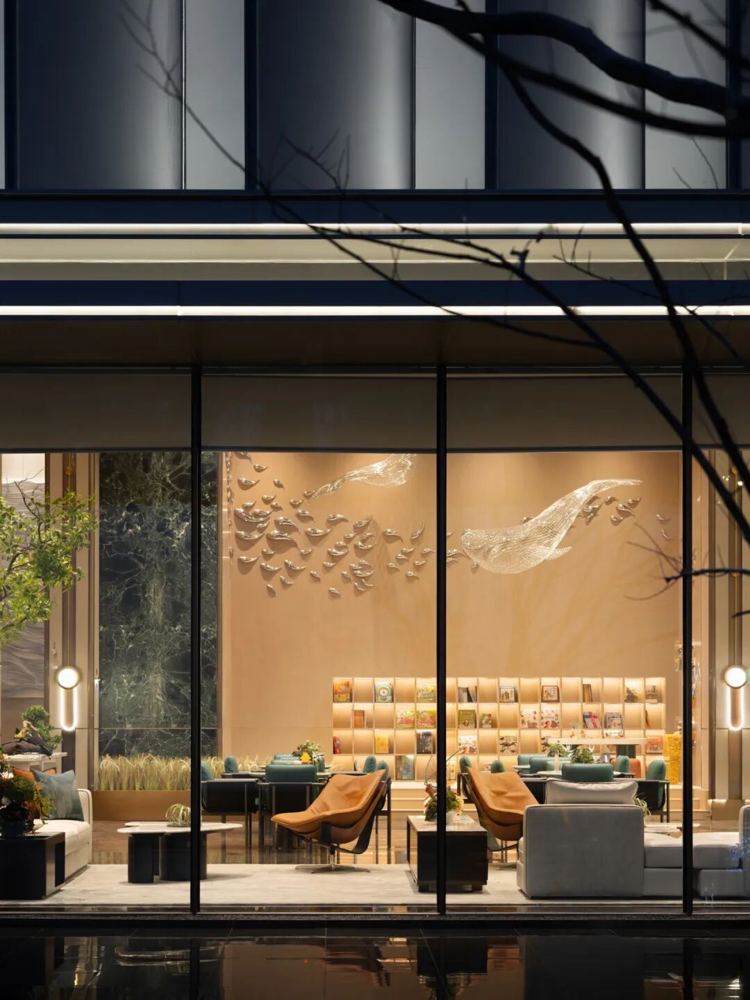 游走的光先是在户外的水景中沐浴,继而折射到透光玻璃窗上,她携取自然界的各种颜色,注入到洽谈区内部,有温暖,有诗意,有体感的空间形象更加具体。