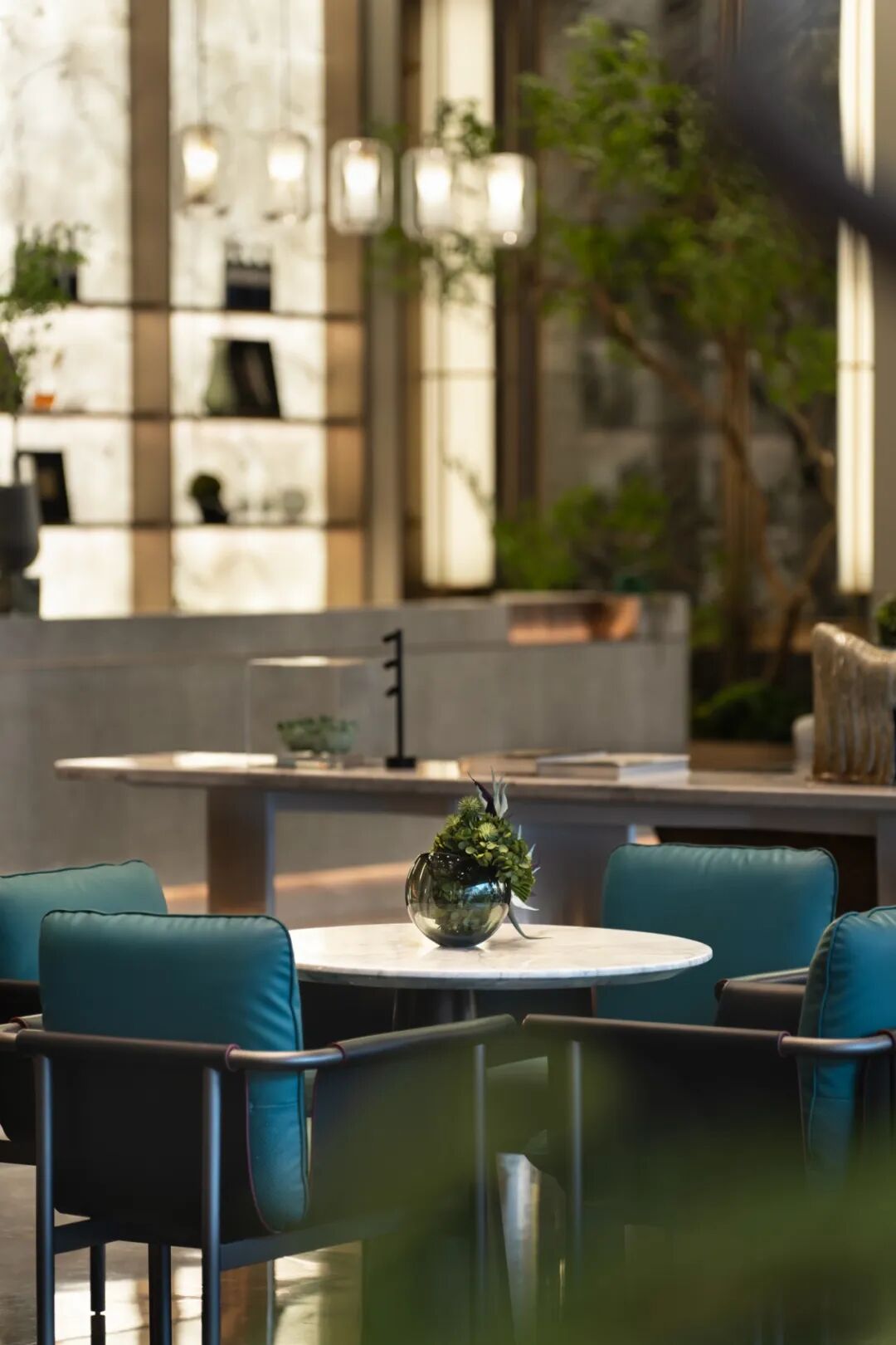 开放式的洽谈空间,空间动线上以造型、灯光等元素中提取,金属质感与灯光的组合设计,界面干净整洁;色彩与植物使用借景的手法,把室外园林带入,栩栩如生的形态无时刻都在提升空间的价值要义。