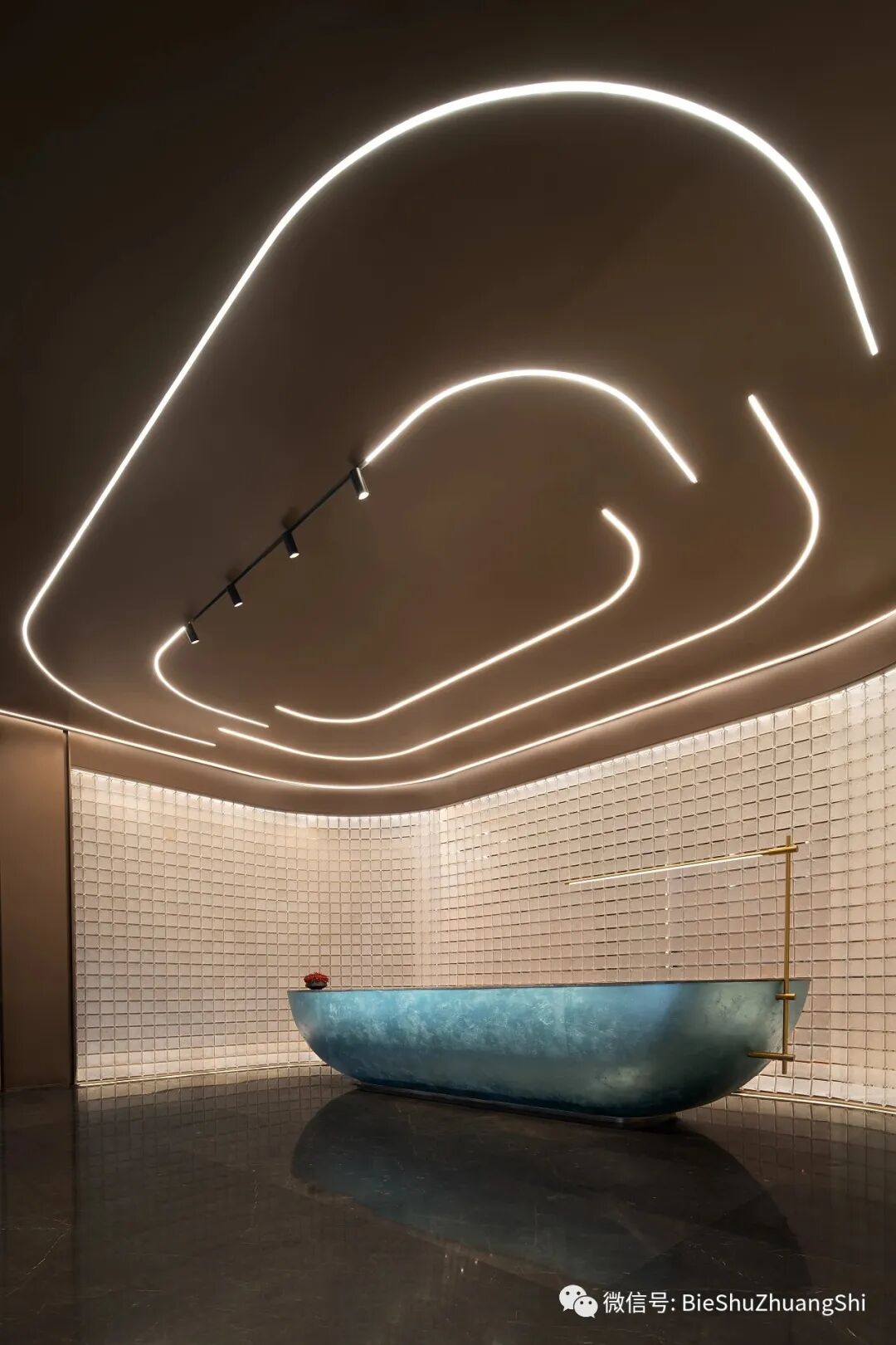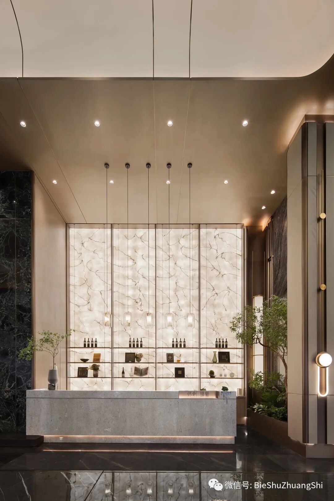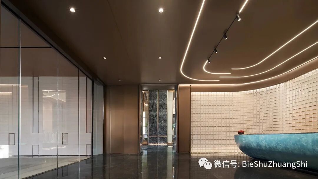 接待前厅将当地独有的山水特色融入建筑内部,设计借助水的流动姿态,嵌入亚克力的背景墙之中,形成给访客的视觉第一感官;而顶部灯光构成的行空,仿佛映照着迎宾处,两者造型相互和谐,形成时空隐喻。