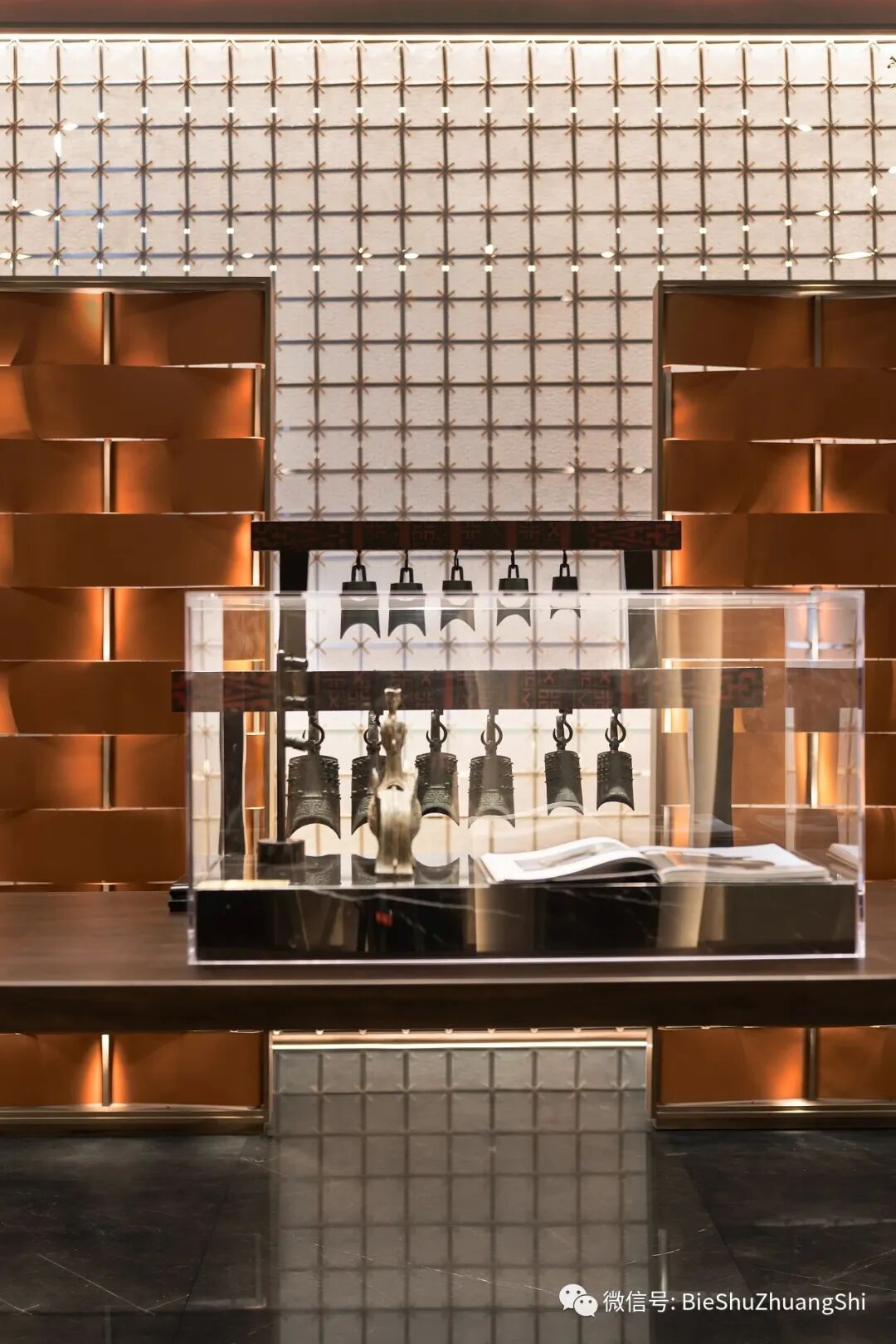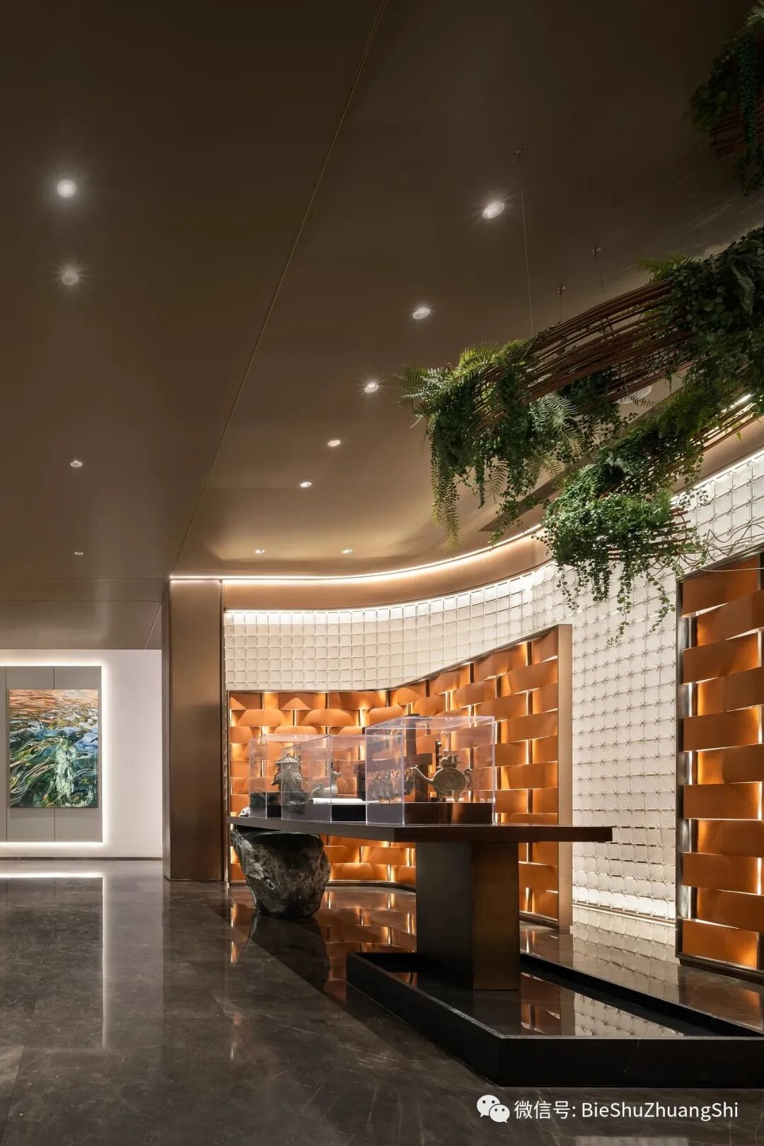 亚克力材质的整体支持,犹如水纹的透景被割为三部分,在顶端交织的藤蔓之下,陈列着极具文化属性和特色的古文物,加持了空间的艺术价值感和传承性,高品质元素的引入,奠定了营销中心的领域实力和权威。