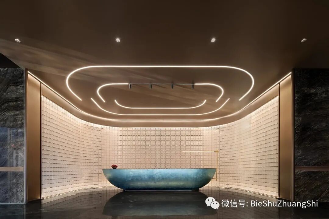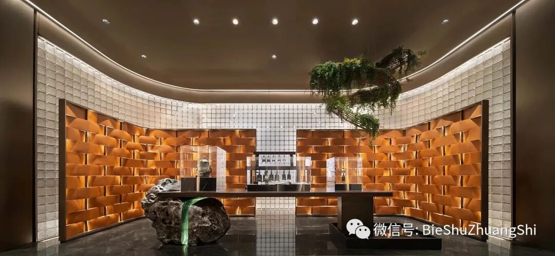 山重水湾,为避免石材的生冷,设计特意用暖黄的饰面介入,在灯光的晕染下,增添了许多暖意,而游动的鱼群打破空间的静置,为空间注入动态的生机,让光影,生机,气息,趣味等不再是遥远的东西。